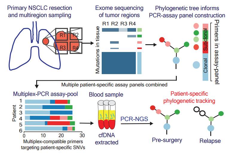 循环肿瘤DNA的系统发生学追踪。Abbosh et al. 英国弗朗西斯·克里克研究所的Charles Swanton及同事在TRACERx肺癌临床试验研究中,前瞻性地监测了100位转移性非小细胞肺癌患者从确诊到复发和死亡的演变过程,他们使用定制的测序面板分析了在术前和术后进行的多次液体活检。他们发现检测ctDNA可以预测治疗结果,如对术后化疗的抗性,在某些情况下还可以比传统临床方法更早地发现复发情况。因此,分析液体活检可能有助于增强识别有可能从术后化疗中受益的患者,并能跟踪复发期间不同癌症克隆和亚克隆的演变。