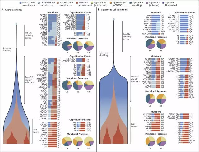 这项研究得到了多个重量级学术期刊的报道(图片来源:《The New England Journal of Medicine》与《自然》) 肺癌是世界上导至癌症患者死亡的主要原因之一,而非小细胞肺癌 (non-small cell lung cancer, NSCLC) 是肺癌中最常见的一种。早期NSCLC患者通常接受手术治疗来切除原发肿瘤,其中很多患者在手术之后还需要接受辅助化疗。但是这些接受辅助化疗的患者中大部分癌症仍然会复发,只有5%的患者能够从辅助化疗中受益。因为化疗的副作用很大,这意味着平均来说,为了让1名患者获益,19名其它患者需要经受化疗副作用的折磨。那么有没有方法能够直接发现哪些患者可以从化疗中获益?或是提早发现那些化疗无效的患者,让他们尽早转向其它疗法呢? 这项研究力图用一种新型血检来解决这个问题。这一检验方法的诞生还要从2014年启动的一项通过医疗跟踪非小细胞肺癌进化的研究项目说起。这一项目试图通过对从早期NSCLC患者肺部切除的肿瘤组织进行深度全外显子组测序(whole exome sequencing),来跟踪NSCLC肿瘤细胞的进化过程。肿瘤细胞随着细胞的不断分裂和增殖会积累不同的基因变异,因此原发肿瘤不同部位的细胞可能携带着不同的基因变异。通过对基因变异的比较,研究人员可以勾画出NSCLC肿瘤细胞不同克隆之间的分子系统发育树 (phylogenetic tree),并且可以建立NSCLC的进化与患者的临床结果之间的关系。