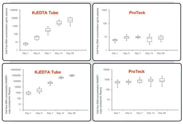 图1. 怀孕母亲和肿瘤病人的cfDNA分别包含来自胎儿和肿瘤的有效信息。通过采集,分离,提取和分析血浆中的cfDNA有助于实现对胎儿和肿瘤的检测与诊断 对于cfDNA的保存,利用超高速离心分离血浆是最直接有效的避免白细胞gDNA干扰的方法。但是实际样品采集中,往往不具备高速离心和冷冻保存的条件。游离核酸采血管便在这种情况下应运而生。这些保存管的目的就是尽可能长时间的在常温状态下保存血浆中的游离核酸。目前商业化的游离核酸采血管,有些利用甲醛等交联剂稳定白细胞减缓背景gDNA的释放。但是这些交联剂会损伤cfDNA,并且会降低测序检出率。 最近,我们了解到一个名为ProTeck® (CFGenome, LLC, Denver, CO)的游离核酸采血管,ProTeck®游离核酸采血管是来自美国CFGenome®公司的最新研发产品。针对游离核酸保存痛点,ProTeck®采血管利用蛋白酶抑制剂和代谢酶抑制剂稳定白细胞,减少其裂解引起的gDNA对cfDNA的污染。 ProTeck®游离核酸采血管容量为10 mL,内含300 μL特有的cfDNA稳定剂,用于抑制血细胞的代谢。与市场的同类产品相比,保存时间长达28天。血浆样品收集到ProTeck®采血管中,即刻便可抑制血细胞的代谢活动,减少gDNA释放。如图2可见,28天内ProTeck®采血管里的cfDNA的整体含量稳定;而在K3EDTA采血管(BD vacutainer®,Becton Dickinson,Franklin Lakes, NJ)中,cfDNA的总量则随着时间推移则有显著增加,原因在于白细胞裂解,释放了大量背景噪音的gDNA片段。