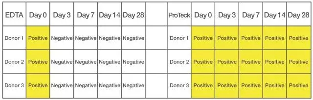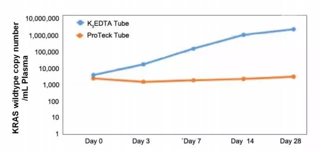 图3. 血浆cfDNA中KRAS野生型基因的在K3EDTA 采血管和ProTeck tube 28天保存期内的拷贝数对比 如表1显示,仅一天后,K3EDTA采血管中的KRAS基因突变(Exon2,G13D)无法被有效检出。相比之下,保存在ProTeck®采血管中的血浆样本即使28天后仍然可以检出该低频突变。