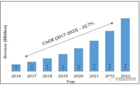 液体活检测试是一项非侵入性血液检测,可为研究人员、医师和外科医生提供有关患者癌症概况的信息和适当的治疗方法。日前,市场调研公司AlliedMarketResearch发布的一份报告显示,揭露了液态活检火爆的市场现状! 报告显示,2016年,全球液体活检市场价值为6.34亿美元,到2023年达到38.05亿美元,2017-2023年间的年复合增长率高达28.9%!液体活检测试是一个快速过程,通常包括简单的抽血、从血浆中提取核酸,以及扩增分子靶标以允许分析所定义的生物标志物。