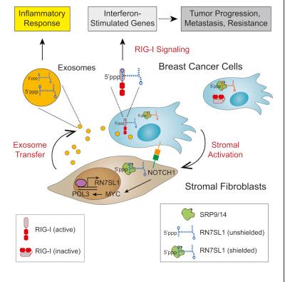模式图。图片来源:Cell 结果,研究人员发现,癌细胞指示成纤维细胞分泌外泌体——这些小囊泡内包含特殊遗传物质使它们看上与病毒十分类似。本研究的第一作者Barzin Nabet以及Minn团队的其他成员使用乳腺癌作为模型,他们发现当癌细胞刺激成纤维细胞时,成纤维细胞分泌的外泌体富含一种特定的RNA——RN7SL1。 与细胞中的大多数RNA不同,RN7SL1具有类似于病毒RNA的特殊末端。在乳腺癌细胞的指导下,成纤维细胞确保外泌体保持病毒样的末端暴露,欺骗细胞对外泌体做出如同病毒感染一样响应。 Minn说:“癌细胞特异性地指导成纤维细胞暴露RN7SL1病毒样末端的能力是一个关键的发现。如果末端被覆盖,乳腺癌细胞就不会像病毒一样对待这些外泌体,这样癌症就不太容易进展,也更有可能对治疗作出反应。另一方面,如果末端总是暴露出来,细胞的反应就会像受到病毒感染时一样。 某些类型的乳腺癌以这种方式指导成纤维细胞的能力可以解释为什么一些乳腺癌比其他乳腺癌更具侵袭性和炎症性。已知具有侵袭性的两种类型的乳腺癌——三阴性乳腺癌和BRCA1癌症比其他较不积极的乳腺癌形式更有可能激活这种抗病毒反应。 Minn说:“由于我们可以通过测试癌症患者的血液来测量外泌体内暴露的RN7SL1的情况,因此我们或许能鉴定出癌症侵袭性更强的患者。现在我们已经知道这种暴露的RNA如何产生,因此我们可以寻找潜在的治疗靶点。” 目前的研究以及Minn团队以前的相关研究表明,NOTCH途径可能是其中一个潜在的药物靶点之一。阻断NOTCH的药物都可以关闭指导成纤维细胞的信号,并且干扰乳腺癌对病毒模拟的反应能力。并且,NOTCH抑制剂等疗法在治疗三阴性乳腺癌小鼠方面也是有效的。 |