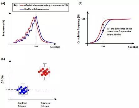 早期qPCR的结果显示母亲血浆中源于怀孕的DNA分子要比母亲的背景DNA短。胎儿和母体DNA最显著的差异是166bp的峰相对地减少和143bp等较小的峰相对地增加。通过母体和胎儿DNA之间大小的差异,已被证明血浆DNA大小的分析可用于检测胎儿染色体非整倍数,如下图。研究发现较小尺寸的cfDNA似乎与较低水平的DNA甲基化相关,这种现象可能在塑造cfDNA片段的大小中起了重要的作用。