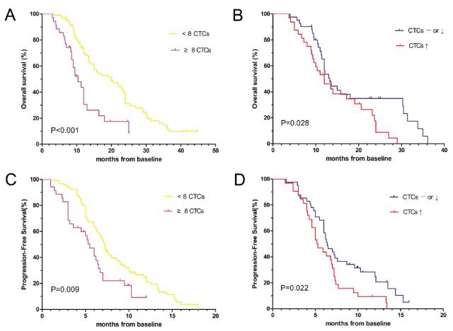 图2 根据基线CTC或CTC变化分组的OS和PFS