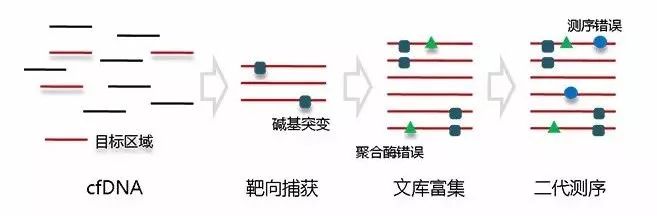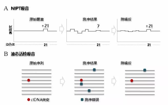 在过去的十年间,二代测序仪制造商Illumina战胜各路豪强,目前已占据了大部分市场份额。现在,购置一台Illumina最新款测序仪Novaseq,俨然和当年拥有苹果手机一样,是企业身份的象征。然而,Illumina的二代测序仪目前也面临着一些问题,例如文库富集以及测序仪的簇生成过程都是由PCR完成,会出现基因组覆盖不均匀的测序噪音;此外,依赖聚合酶的边合成边测序难以保证碱基准确性,将产生碱基错误的测序噪音。因此,在下游应用过程中,降噪技术显得尤为重要。 在2015年的CSCO大会上,贝瑞和康推出了自主研发的游离DNA富集技术,环化单分子扩增和重测序技术(Circulating Single-Molecule Amplification and Resequencing Technology,以下称为cSMART);该技术不单适用于无创单基因遗传病检测,更重要的是,cSMART技术特性满足液态活检高灵敏高特异性的要求,在肿瘤辅助诊断、用药指导、进展监测等临床领域均有广阔的应用前景。此外,2016年的CSCO大会,安可济公司推出自主研发的“Firefly™”游离DNA靶向测序技术,采用单链环化DNA滚环复制串联重复确认法,凭借全球领先的技术性能,在肿瘤个体化诊疗中取得了令人瞩目的成绩(6)。据安可济创始人林盛榕博士介绍,将这项技术命名为“Firefly”是因为萤火虫巧妙暗喻了该检测技术的降噪特性:相比白天(降噪前),夜晚(降噪后)的萤火虫才格外醒目。 基于NGS平台,从NIPT到液态活检其噪音源是什么,如何降低?另外我们注意到,领军企业贝瑞和康和行业新贵安可济都不约而同地提到了“环化”这个概念,环化到底有何优势? 接下来,我们围绕二代测序的两大临床应用,NIPT和液态活检技术中如何降低测序噪音的问题,和大家一起分享如何突破测序仪本身的技术限制,开创崭新的基因检测时代。在阐述这些问题之前,先简单介绍一下NIPT和液态活检的检测原理。 都是靠数数,怎样才记作1次? NIPT的检测原理是对怀孕母亲血液中的cfDNA进行高通量测序,通过统计测序Reads比对到染色体的次数来推测cffDNA(胎儿游离DNA,cell-free fetal DNA)的异常(图1A),以此预测胎儿染色体数目是否正常;换句话说,NIPT的基本原理就是数数。如图1B所示,在NIPT检测中,比对到基因组某条染色体的一整条Read算是1次。同样,液态活检也是靠数数来推测某条cfDNA是不是ctDNA,只不过检测分辨率从NIPT的染色体提升至单分子的单碱基水平,也就是大家常常听到的低频突变检测;所以,液态活检对碱基准确性提出了更高要求,必须降低测序错误噪音。 图1:NIPT和液态活检的检测原理(图1A节选自[1]) 降噪方案 NIPT通过检测cfDNA来间接评估胎儿基因状态,而通过羊水穿刺样本可以直接检测胎儿DNA反映胎儿基因的真实状态;液态活检通过检测血液中的ctDNA间接反映患者的肿瘤基因组变异,而使用组织样本则可以直接对肿瘤组织中的突变信息进行解读。相比“直接”的检测手段,这些“间接”的方法更容易受到干扰,我们将一切干扰正确判断的因素都称为噪音源,包括上面提到的Illumina平台仪器产生的噪音。