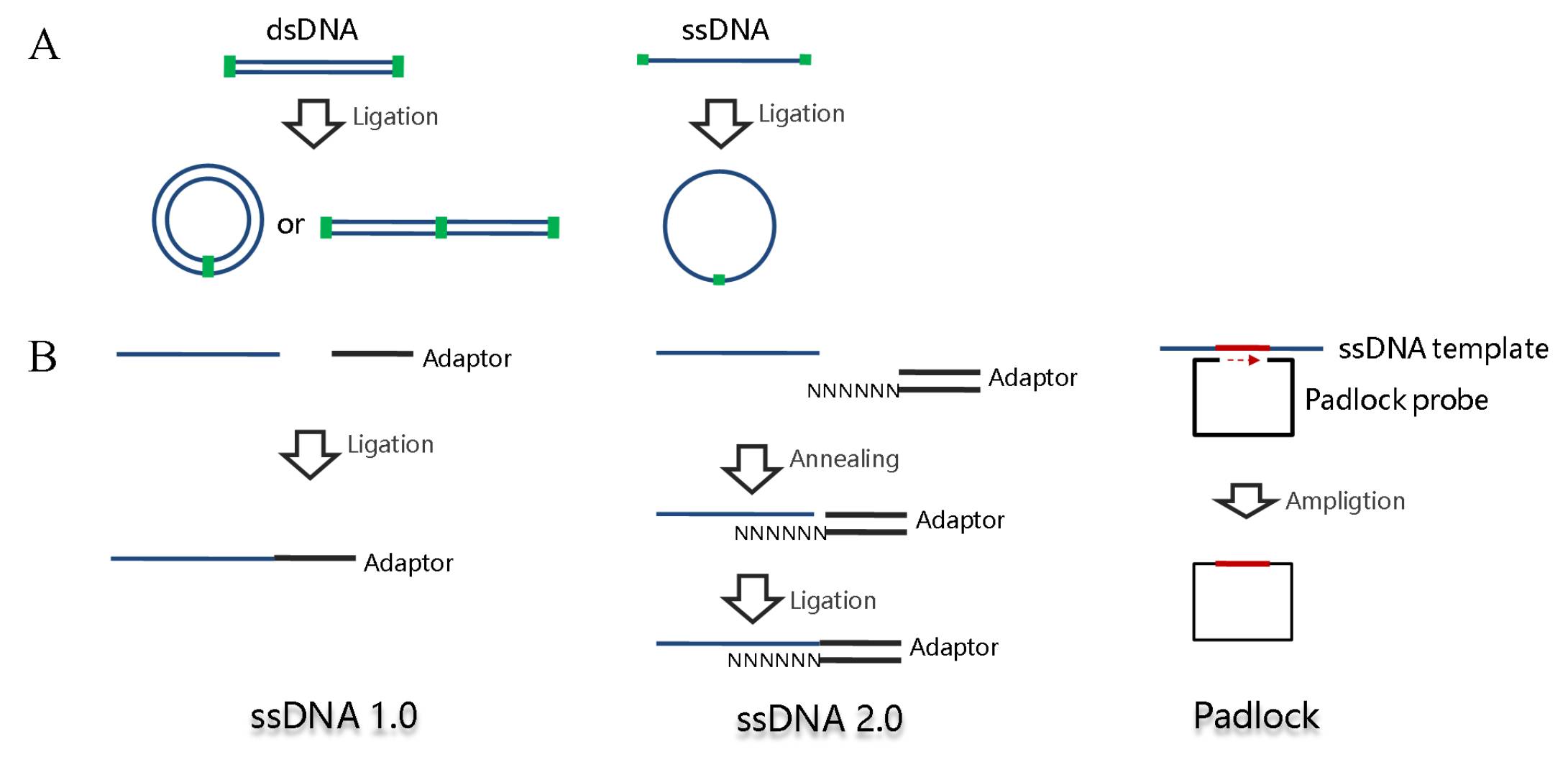区分ctDNA多以单碱基突变为特征,他们在总cfDNA的含量较低,当测序错误率与ctDNA在cfDNA中占比相当时,比如都是0.1%,在这种情况下,我们无法判断观测到的某个突变是测序错误还是真实存在,ctDNA特有的标记便被淹没在错误噪音中(图2B)。 打个比方,某个坏人躲在人群中,他有两个特点,一是身高一米七,二是蓝眼睛,但是警力有限,只能重点排查,靶向捕获就是先把一米七左右的人找出来,然而我们发现很多一米七的人居然也是蓝眼睛,究其原因可能一些普通人带着蓝色的隐形眼镜,得先把隐形眼镜摘掉才能进一步判断,这里说到的蓝色隐形眼镜就是液态活检的噪音。 图3:液态活检流程中产生的背景噪音 利用二代测序进行液态活检的检测流程也可理解为一种靶向测序技术,通常我们指的靶向测序是对某个感兴趣的基因组区间进行特异检测,比如外显子靶向测序;只是在液态活检中,靶向的基因在肿瘤诊治中具有临床意义,比如靶向用药指导、肿瘤复发监控等。 如图3所示,液态活检技术流程中的噪音源可以细分为三个部分,第一部分来自于靶向捕获技术,也就是在召集身高一米七的人的过程中;第二部分是在文库扩增富集时由PCR聚合酶产生;最后就是测序仪本身的测序错误。前两种噪音属于文库构建层面,可以通过技术优化降低,测序仪的错误是基本固定的,最后,残留的噪音可以通过单分子标记技术进行矫正。下面我们先介绍一下前两种噪音如何产生以及优化思路。 首先,先谈谈靶向富集技术,现在的主流方法有两种,扩增子(PCR)和杂交捕获(图4A),杂交捕获存在两个明显的弊端,1) 实验操作比较繁琐,流程较长,不符合短周期样本的临床检测需求;2)探针杂交过程会对DNA造成损伤,导至碱基突变,噪音升高(图4B)。扩增子技术无探针杂交过程,不会产生额外噪音,操作简单,流程便捷;因此,常被液态活检采用。 图4:A. 两种常见的靶向捕获技术;B. 探针杂交过程产生的背景噪音(节选自[2]) 不过,扩增子技术并不是没有缺点,它靶向检测区域较小,特别是传统扩增子技术存在cfDNA模板丢失的问题,痕量的ctDNA可能趁机溜走。如图5A所示,cfDNA长度~170bp,不能同时被两侧引物覆盖的cfDNA就损失了。 图5:A.双侧引物扩增富集示意图;B. 单侧富集技术之成环;C. 单侧富集技术之锚定PCR 那么,工程师,你看怎么办?工程师:单侧引物富集。之所以说现代分子生物学的技术储备是二代测序得以蓬勃发展的土壤就是这个原因,测序前的样本处理过程,是一个完全开放的平台,研究人员可以运用人类所有的分子技术成果来达成研究目的。 单侧引物富集可以通过两种思路完成,第一,锚定PCR。如图5C所示,在PCR之前,在DNA分子的两端连接上已知序列,这样,即使cfDNA只含有单侧引物的结合位点,也可以与事先连接上的已知序列引物配对,进行PCR富集。第二,先成环再富集(图5B)。与锚定PCR一样,cfDNA分子内成环后,同样可以使用单侧引物富集文库。 如图6所示,我们看到了熟悉的质粒,有没有感觉场景突然被拉回到超净台,不过,这是一种基于克隆构建成环的二代测序技术,称为Cypher-Seq,2015年发表在Nucleic Acids Research杂志,在Cypher-Seq技术中,Illumina接头被制备成了载体,插入片段是待研究的目的DNA,可检测频率低至2.4x10-7的突变。 图6:低频突变检测技术Cypher-Seq流程示意图[3] 我们注意到上述方法是通过双链进行成环,双链成环有一个弊端,就是分子间的串联现象会比较严重,影响底物利用效率,因此,研究人员往往会选择特异性更强的单链分子内部成环(图7A)。 图7:A. 单链成环具有更强的特异性;B. 两种增强单链连接效率的方法 然而,特异性提高了,单链成环的效率却降低了,主要是因为单链DNA的连接效率是显著低于双链DNA的,所以,解决时就会用到一种伟大的思想,叫“没有机会,那就创造机会”,没有双链,人为制造双链结构。如图7B所示,在2013年,Nature Protocol报道了一种单链DNA连接建库的方法(ssDNA 1.0),该方法通过延长连接时间(过夜)来增加效率,流程非常耗时(4);2017年,Nucleic Acids Research公布了该流程的升级版本,在ssDNA2.0中,研究人员将单链接头改造为部分双链,在底物与接头的单链部分退火后,就获得了期望的双链结构,这时候T4 DNA连接酶的工作效率就非常高了,连接时间被压缩到1小时(5);此外,像Padlock技术一样,加入一段与单链分子互补配对的序列形成双链结构,连接效率也能够得到极大提升,类似的原理都可以用于提高单链连接效率。上面谈到的锚定PCR和成环技术,都是为了提高模板利用率,防止微量的ctDNA在此过程中丢失。 图8:A:传统指数PCR扩增;B:线性纵向扩增;C:线性横向串联扩增 下面,接着介绍噪音来源的第二部分,文库富集过程中,由聚合酶产生的碱基突变。文库富集有两种方法,一是指数扩增,二是线性富集。如图8A所示,指数扩增时,引物会以新合成的DNA为模板进行下一轮二链合成,所以某次突变会积累下去;而线性富集始终保持以原始DNA为模板,某次合成出现的突变不会继承传递(图8B);所以,借助线性扩增,聚合酶的合成错误不会因为指数扩增而被无限放大。 线性扩增又可分为横向和纵向两种,如图8C所示,横向线性扩增以成环的DNA为模板,利用聚合酶强烈的链置换活性(比如phi29、Bst DNA聚合酶等),不停的剥离上一轮合成所产生的二链,得到了横向串联重复的线性模板,横向与纵向线性扩增方式一样,均具有背景突变不会积累的优势(图8C)。phi29聚合酶保