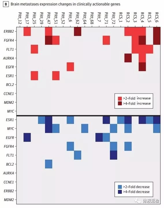 本着悬念要层层展开的理念,研究人员先进行了一番欲扬先抑的结果展示。 图1 原发灶与脑转移灶中固有分子亚型情况 铺垫部分就告一段落了,下面进入传说中的神转折部分。 图2 具有临床意义的10个基因在BrM患者中的表达变化 图3 局部乳腺癌、转移性乳腺癌、脑转移乳腺癌患者ERBB2/HER2表达水平差异 种种现象说明,乳腺癌向脑部转移确实是有迹可循的,HER2表达上调是脑转移的一种潜在标志物。如何利用这一现象为患者提供临床收益?第一,更早地发现转移风险;第二,对症下药。循环肿瘤细胞(circulating tumor cell, CTC)具备兼顾这两个应用点的潜力,已有研究显示转移性乳腺癌患者其原发灶、CTC、转移灶HER2表达状态不同,即便原发灶HER2-,但CTC HER2+的患者仍可从靶向治疗中获益。另一篇推送中也提到过CTC发展为脑转移的一系列分子层面的变化,因此CTC或可用于及早发现转移风险。 相关推送链接:预测乳腺癌脑转移,CTC又立功 参考文献:Priedigkeit, N, et al. "Intrinsic Subtype Switching and Acquired ERBB2/HER2 Amplifications and Mutations in Breast Cancer Brain Metastases." Jama Oncology 3.5(2017):666. |