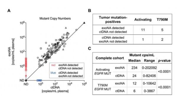 克服ctDNA突变检测数量限制的一个手段可能会是来自外泌体的肿瘤相关RNA。外泌体是由活细胞(包括肿瘤细胞)释放的小囊泡,并携带RNA、DNA和蛋白质。使用外泌体RNA(exoRNA)来识别肿瘤起源的体细胞突变先前已被证明,但exoRNA和cfDNA二者的组合提取(exoNA)尚未被阐述,也没有阐述比单独使用ctDNA的优势。外泌体的一个重要特征是,存在于血浆和其他生物流体的核酸是在这些囊泡的内腔中的,这些核酸结构完好,免受核酸酶的消化,是良好质量的RNA。此外,外泌体从由活细胞中主动释放出来,而ctDNA则是通过细胞凋亡或坏死从死亡细胞中释放出来的。研究人员推测,外泌体RNA上存在的额外突变以及它们来源于活跃生长的肿瘤细胞可能有助于改进目前基于血浆的EGFR突变检测。