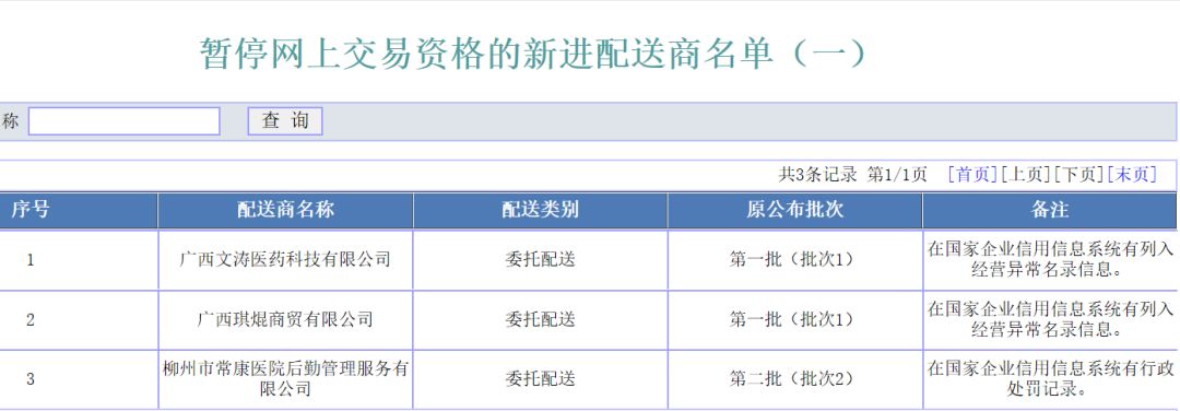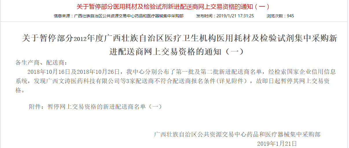 在1月21日,广西壮族自治区药械集中采购网发布《关于暂停部分医用耗材及检验试剂新进配送商网上交易资格的通知》,3家配送商被暂停网上交易资格! 两家在国家企业信息系统有列入异常经营名录,另一家则是有行政处罚记录!