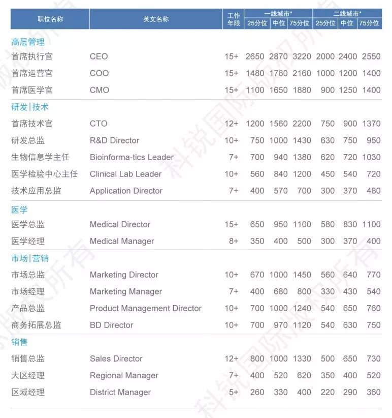 人才来源:同类公司、金融公司、海外医药公司、咨询公司。 医疗服务人才 在健康中国战略的指引下,完善预约诊疗制度、远程医疗制度、临床路径管理制度等,充分运用互联网+、大数据、人工智能等新技术,促进医疗服务高质量发展,提高国民健康指数。具有专业技能或成熟经验的人才缺口愈发明显。 人才缺口:医院总经理/院长、运营副总裁、投资并购副总裁、首席医疗官、各科室主任 人才来源:非公立和公立医疗机构、医疗服务机构、健康管理机构、体检机构、高端酒店等服务机构、保险机构 医疗信息+互联网+大数据 临床结构化有效数据的把控成为医疗AI下半场的关键。国家主导筹建的三大健康医疗大数据集团牵手细分领域AI技术供应商,在五个省份开展国家健康医疗大数据中心试点,目前已有30余个省市响应出台地方政策。医疗大数据不仅显著推进了医院信息化发展,在制药、器械、保险等行业也不断探索场景应用。 人才缺口:医学经理、临床项目经理、产品经理、深度学习研究员、架构师、大数据科学家等。 人才来源:医院、药械企业、医疗信息化企业、互联网/IT企业、高校研究院 个体化医疗相关公司 继广州燃石、诺禾致源肿瘤NGS多基因检测试剂盒获批,也即将迎来NGS产品上市的爆发浪潮。随着检测样本的积累,生物信息分析、临床数据整合,将日益成为竞争主体的核心竞争力。 人才缺口:生物信息、医学、注册、销售。 人才来源:基因检测、传统医药和器械公司、科研所、医院。 职位薪酬区间——医药 职位薪酬区间——器械设备 职位薪酬区间——医疗服务 职位薪酬区间——个性化医疗 职位薪酬区间——医疗大数据 职位薪酬区间——互联网医疗 报告来源:科锐国际《2019人才市场洞察及薪酬指南》 |