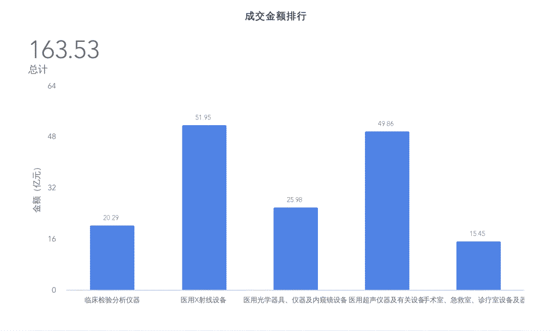 医用X射线设备以51.95亿元的成交额居各医疗器械之首,医用超声仪器及有关设备则紧随其后,也有49.86亿元的成交额,排在的第三的则是医用光学器具、仪器及内窥镜设备,总成交金额为25.98亿元。