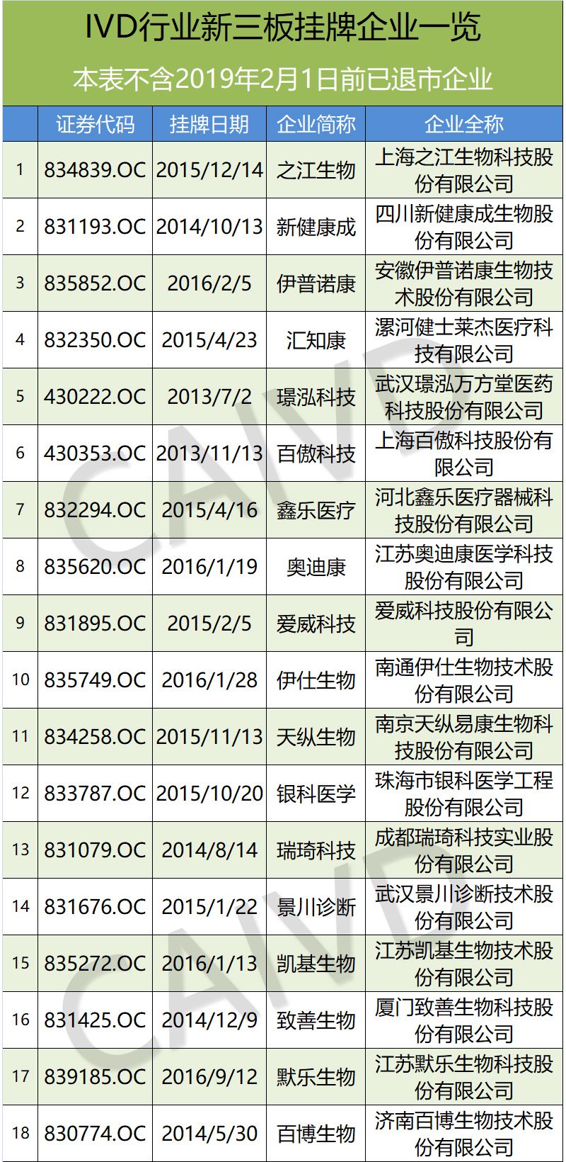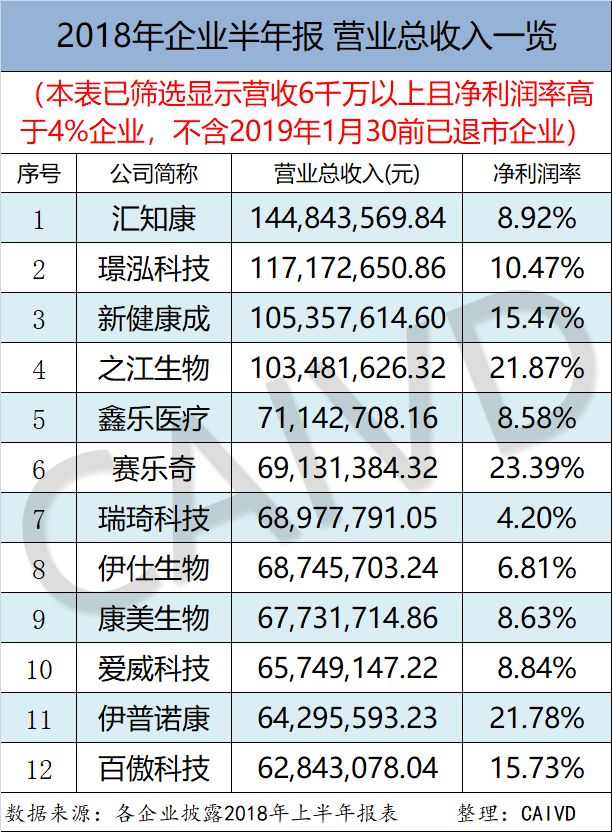 随着中国人口老龄化加速,国务院对分级诊疗的加快推进,创新医疗器械特别审批程序的发布,及"健康中国2030"规划纲要的实施,我国体外诊断市场持续保持快速发展趋势。近2年,明德生物、新产业、兰卫检验、菲鹏生物、宝藤生物、乐普基因、恒升医学、康泰医学等近20家企业相继从新三板摘牌退市,其中明德生物已于2018年7月成功登录A股,相当一部分退市企业也在创业板、IPO进程中,新三板对高成长型体外诊断企业的具有明显的推动作用,并成功孵化了多个优质企业乃至细分行业龙头。 小编现将目前体外诊断行业新三板挂牌企业整理如下: 一、IVD行业新三板部分企业挂牌信息 二、12家IVD企业2018半年报营业总收入一览 2018年上半年,营业总收入大于6000万元且净利润高于4%的企业有12家,分别是汇知康、璟泓科技、新健康成、之江生物、鑫乐医疗、赛乐奇、瑞琦科技、伊仕生物、康美生物、爱威科技、伊普诺康、百傲科技。 根据CACLP 第十六届国际检验医学暨输血仪器试剂博览会相关数据显示,以上总营收排名前12家企业中,有10家企业报名参展了2019年3月的博览会,参加率占比高达83.3%,可以看出营收高的企业对于品牌建设及产品传播、业界交流等方面的重视程度较高。