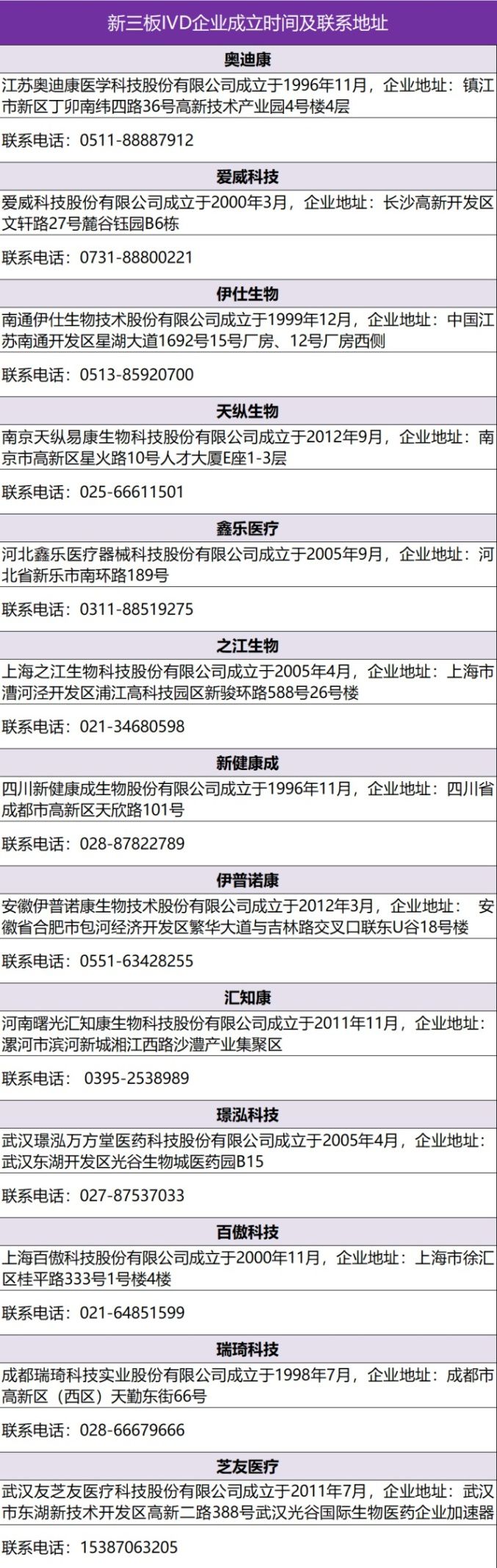 三、16家净利润高于500万的IVD企业半年报的一览 2018年上半年,归属净利润高于500万的企业有16家,之江生物以2262千万位列第一,该公司目前是国内分子诊断试剂生产的龙头企业之一。赛乐奇以1616千万位列第二,新健康成以1452万元位列第三,其他13家企业分别是之伊普诺康、汇知康、科方生物、璟泓科技、百傲科技、高盛生物、力博医药、珈诚生物、鑫乐医疗、奥迪康、 康美生物、 爱威科技、 伊仕生物。 四、企业成立时间及联系方式 新三板市场生命力旺盛,随着政策支持和监管完善,已成为IVD高成长企业实现定向融资、股份转让增值、并购重组、直接转板的孵化器。而创科板的出现,为科技型、创新型IVD企业带来了更多希望。2019年,让我们一起见证IVD企业的成长之路!期待更多的IVD龙头企业诞生! 声明:以上罗列的企业且并未涵盖新三板IVD所有企业。欢迎补充与指正。 |
