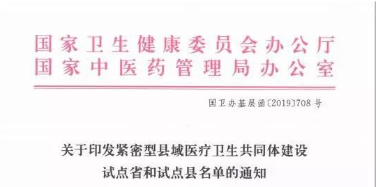 2019年8月29日,国家卫健委、国家中医药管理局正式发布了《关于印发紧密型县域医疗卫生共同体建设试点省和试点县名单的通知》,(以下简称《试点名单通知》)。