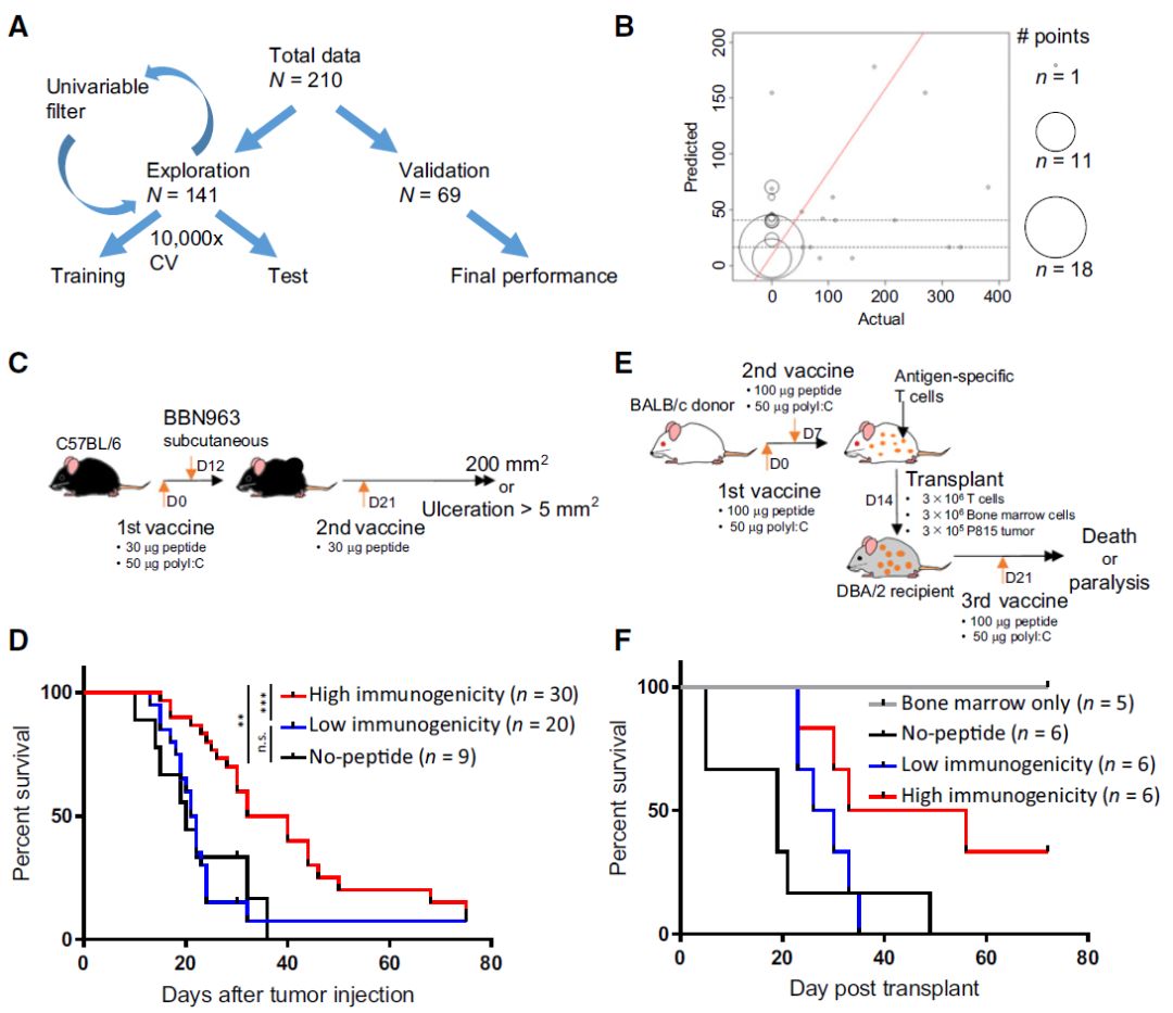 近日,北卡罗莱纳大学的研究人员设计并验证了一个新的机器学习算法模型,该模型可以预测特定肿瘤特异性抗原产生免疫反应的能力,有助于克服研制个性化癌症疫苗的重大障碍。 抗原是免疫系统区分正常细胞和癌细胞的标志,而肿瘤新生抗原(Neoantigen)的发现对癌症的诊断、过继性免疫治疗、肿瘤疫苗、个性化治疗起着极其重要的作用。随着高通量测序技术的发展以及国际大型肿瘤基因组研究项目(如COSMIC、TCGA)的开展,获得了大量肿瘤突变数据,为基于机器学习算法的抗原发现提供基础。 通过对癌症患者的基因组测序,往往可测出数万个突变,经过机器学习预测后可得到的新生抗原有数十个,但进入临床阶段后有免疫反应的寥寥无几甚至没有。如果算法能够预测出能产生免疫反应的新生抗原,就可以大大降低成本和缩短研究时间。 肿瘤疫苗制备流程图 当前的肿瘤新生抗原预测算法主要通过对表位/MHC亲和力预测选择潜在的抗原表位,这些算法最大的问题是都不能准确的预测抗原表位免疫原性,也就无法准确预测这些抗原能否触发人体免疫系统对抗癌症。 针对这个问题,研究人员设计并验证了一种新的机器学习算法,以预测特定肿瘤特异性抗原(tumor-specific antigen,TSA)产生免疫反应的能力。并发表在近日的《Cancer Immunology Research》上。 肿瘤抗原预测和抗原内在性质鉴定示意图。A,研究采用的各个肿瘤模型中MHC-I和MHC-II类新生抗原/mHA数量。B,新生抗原/mHA预测以及ELISpot验证流程。C,抗原性质鉴定,包括氨基酸序列以及:(I)绝对位置,(II) 相关位点,(III)突变位置 ,(IV)每个多肽的起始、中间和末端。 随后,研究人员将这个算法在两个小鼠肿瘤模型进行了验证,并证实该算法可以预测具有潜在治疗价值的抗原。 梯度推进模型(gradient boosting model, GBM)方法预测的肿瘤新生抗原/mHA免疫原性的验证。A,GBM模型的交叉验证方法示意图。B,最终的GBM在验证数据集中的表现,X轴表示实际的免疫原性评分,Y轴表示预测的免疫原性评分,圆圈大小表示抗原数量,红线为最佳拟合线。C和E为肿瘤疫苗的体内验证流程图,C为小鼠膀胱癌模型(BBN963),E为P815肥大细胞瘤小鼠模型。D和F为两种小鼠模型Kaplan–Meier生存曲线。 在小鼠模型中成功验证后,研究人员推测人类肿瘤新生抗原的免疫原性也有相似的规则。并通过TCGA数据库中结肠癌和肺腺癌相关数据集进行了验证,证明了该算法可发现肿瘤新生抗原与免疫原性的联系。 在TCGA人类数据库中预测的肿瘤新生抗原关联分析。A,TCGA泛癌数据集中HINs和IGS的数量关系,X轴为GLM系数,Y轴为-log10(q值)。B,每个TCGA数据集的HINs和IGS数量关系的GLM回归热图。C,TCGA结肠癌数据集的HINs(X轴)和MSI值(Y轴)的关系,D,IGS平均表达水平的GLM系数与-log10(q值)的火山图。 注:HINs(highly immunogenic neoantigens, 高免疫原性新生抗原),MSI (microsatellite instability, 微卫星不稳定性),IGS(Immune gene signatures,免疫活性基因表达谱) 随着肿瘤疫苗在肿瘤临床治疗上重要性的逐渐提升,该方法提高了预测抗原表位免疫原性的精确性,有助于更好的筛选肿瘤特异性抗原,缩短肿瘤疫苗临床应用的周期。 参考文献: Machine-Learning Prediction of Tumor Antigen Immunogenicity in the Selection of Therapeutic Epitopes. Cancer Immunology Research(2019). DOI: 10.1158/2326-6066.CIR-19-0155 |