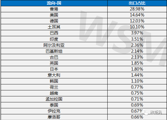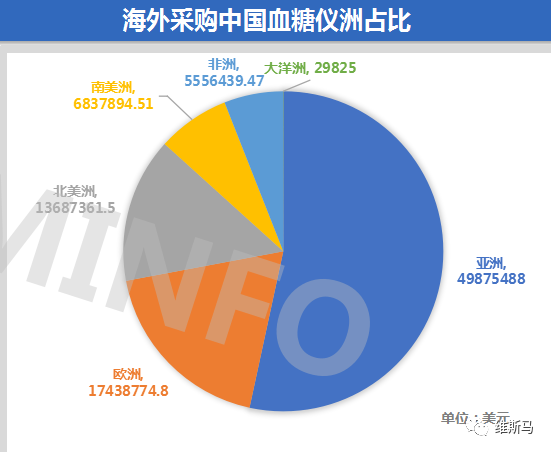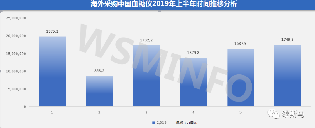 分析定义 海外采购规模简析 2019年上半年分析 2019年上半年血糖仪共向148个国家和地区出口,出口额0.9亿美元,2019年上半年各洲出口占比,亚洲53.39%、欧洲18.67%、北美洲14.65%、南美洲7.32%、非洲5.95%、大洋洲0.03%。 海外采购规模简析 2019年上半年分析 根据大连维斯马研究中心统计2019年上半年血糖仪数据,出口额最大的为1月1975万美元,最少的为2月868万美元。 2019年上半年海外采购中国血糖仪 海外采购中国血糖仪采购国排名 2019年上半年出口TOP10地区为中国香港、美国、德国、土耳其、巴西、印度、阿尔及利亚、巴基斯坦、古巴、英国。