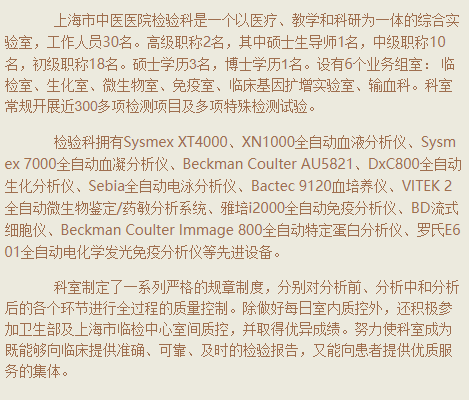摘要: 上海市中医医院检验科是一个以医疗、教学和科研为一体的综合实验室,工作人员30名。高级职称2名,其中硕士生导师1名,中级职称10名,初级职称18名。