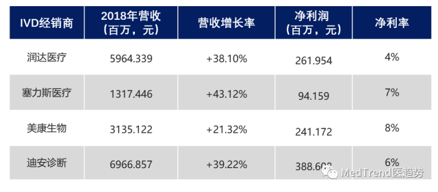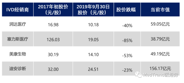 最近两三年,影响IVD行业各个层面的政策频出:两票制、4+7带量采购、DRG按病种收费、检验项目收费标准下调、医学实验室集采、共建模式等,在IVD领域掀起阵阵“腥风血雨”。 深度剖析这些改革措施,会发现其核心都是围绕着去除冗余环节和驱逐劣币,因此,中国IVD经销商在这场改革风暴里首当其冲。 经历过暴风雨的洗礼,IVD经销商们的现状如何?哪些仍屹立不倒?哪些又逐步退出舞台? IVD经销商陷入股价低谷 自2017年“两票制”大力推行以后,IVD经销商所面临的“优胜劣汰的丛林法则”更为严苛。大批小代理商无法存活,销声匿迹;而大代理商在经历了一系列的跑马圈地之后,是否如市场预测一般“强者更强”了呢? 从营收增长来看,IVD经销商们的业务一片欣欣向荣。 ![]() 润达医疗、塞力斯医疗营收同比增长分别达到+38%、+43%;而在2016年、2017年通过并购进入IVD经销市场的美康生物、迪安诊断也分别达到了+21%和+39%的高增长。 然而从股价的表现来说,IVD经销商们所面临的境遇并不美妙。 ![]() ▲四家从事IVD经销业务公司的股价变动 从上表可以看到,相较于2017年年初的市场高度看好,截至2019年9月底, 润达医疗股价下滑40%;塞力斯医疗股价下滑高达85%,从126.03元/股的高价跌至19.05元/股;美康生物、迪安诊断同样市场表现不佳,股价分别下滑53%和23%。 新近港股上市的IVD经销商“新华系”华检医疗的市场表现同样略显惨淡。 2019年7月12日,华检医疗首日挂牌时,开盘20分钟内,股价下跌8.47%,达到当日最低的2.81港元/股,后来虽然回涨,但截至10月9日收盘,股价仍未超越首发价(首发价:3.07港元/股)。 IVD代理商“八仙过海” IVD代理商们营收高涨,股价却陷入低谷,如此魔性的市场表现下,究竟是什么原因?而在股票市场低迷的环境下,IVD代理商们又在靠什么度过难关? 1 润达医疗:独辟蹊径,民营变国营 2019年9月1日,润达医疗放出重磅公告,自此民营变国企。 公告称,公司股东合计将20.02%股份转让给杭州市下城区国有投资控股集团有限公司,并委托了6.98%股份的表决权。下城国投合计获得27%股份表决权,成为润达医疗新的控股股东。交易总价75.11亿元,溢价27%。 因杭州市下城区财政局持有下城国投100%股权,润达医疗实际控制人由润达医疗创始人刘辉及其母亲朱文怡变更为杭州市下城区人民政府。 润达医疗表示,此次股份转让旨在引进国有企业战略投资人以增强公司融资实力和业务竞争力。这也就意味着,润达医疗在寻求更为强大的资本力量,缓解其资金压力,以支撑其在IVD经销市场的征战。 在这场控股权交易之前,润达医疗在“两票制”的大潮下“跑马圈地”得不亦乐乎。一方面渗透上下游产业链,另一方面覆盖更广阔的市场: 仅2016-2017年的两年里,润达医疗前后发起投资并购共9起,累计金额30.54亿元。其中,5起并购侧重于IVD产品研发及实验室信息管理研发,4起侧重在地域渠道上的跑马圈地。到2017年年底,润达医疗qixia全资或控股子公司超过30家。 这些并购不仅仅使得润达医疗迅速占据市场,同时也使得润达医疗需要大量的资金进行流转。 2018年5月,润达医疗发布重大资产重组消息:拟以发行股份及支付现金方式收购苏州润赢70%股权、上海润林70%股权、杭州怡丹25%股权、上海伟康60%股权及上海瑞美55%股权,交易总对价11.37亿元。 不过由于“标的公司有关改制及国有产权变动、内控和业务合规性的信息披露不充分”,经过半年的曲折问询,这项重组申请于2018年年底被证监会否决。 2019年9月的这场控股权变更中存在“对赌”。润达医疗需要在未来3年分别实现3.2亿元、3.5亿元、3.8亿元归母净利润。现有的财务数据显示,润达医疗在2016年、2017年、2018年、2019年上半年分别实现归母净利润1.16亿元、2.19亿元、2.62亿元、1.75亿元。 也就是说,这场控股权变更要求润达医疗在未来3年里保持高营收增速,对其本身也是挑战。 2 塞力斯医疗:投资1.08亿元加码集约化服务 塞力斯医疗一直热衷于医用耗材打包一体化服务,为二、三甲医院的检验科提供打包配送服务、共建区域检验中心等业务。 但政策的变化使得IVD代理商甚至生产企业涌入检验科打包领域,而医联体、医共体的建设,推动了区域内医院联合自建区域检验中心的进程,这些都对类似业务形成了最直接的挑战。 压力之下,塞力斯医疗将目光放在了集约化运营服务商。 2019年4月,塞力斯医疗发布公告称:扩大在医疗耗材集约化运营服务(SPD)业务项目,投资1.08亿元。 SPD是一套与医院对接的物流管理系统,由专业的物流服务商提供整体的医院物资物流运营管理配套服务。通过将条码识别技术应用于院内系统,使得医院内流程重建并更加规范化。值得注意的是,塞力斯医疗变更后的SPD模式还包括为医院提供服务期医用耗材结算服务。 这种模式对于医院和供应商来说基本是一个双赢的模式: 对于医院来说,通过集约化配送,可以减少供应商的数量,降低检验科成本。对于集约化供应企业来说,由于具有完善的供应链体系和物流服务体系,虽然集约化服务价格有所下降,但是通过整体体量的扩大换取最终利润净值空间,同时还可以推荐医院科室使用自身代理的好产品或自产产品。 SPD模式将塞力斯医疗业务从单纯的实验室试剂耗材供应扩展到了医院全耗材的供应,并辅以专业的软件系统,帮助医院实现精细化的管理。但在塞力斯欲通过这种精细化运营管
