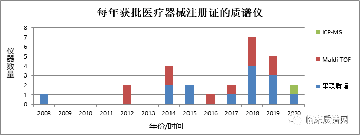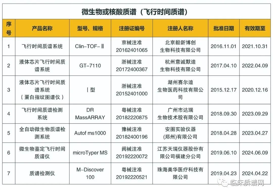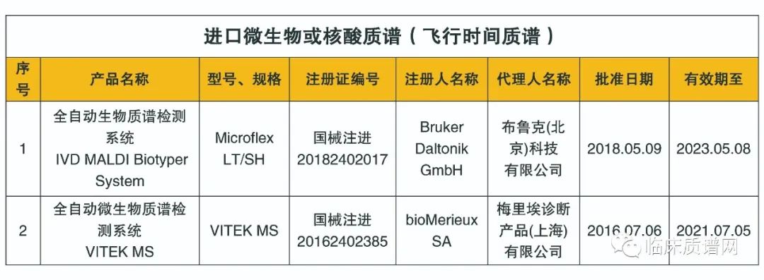由于国内对质谱的需求急剧增加,为能更好的服务于临床检测市场,国内外各大质谱厂商将其优质产品向国家药品监督管理局或省级药监局(NMPA,原CFDA)进行申报,其中一些质谱检测仪器已经获得相关医疗器械注册证。国家药品监督管理局最早批准质谱技术应用于临床是在2008年,早期质谱技术在临床上的应用主要集中于串联质谱法新生儿遗传代谢病筛查领域。直到2017年以后在各大质谱厂商、本土试剂厂商、第三方独立医学检验机构等行业上下游企业的积极推动下,质谱在临床检测中的应用越来越广泛和深入。近些年,医院对质谱技术的认知和接受度也在快速上升。整个临床质谱行业在2018~2019年也迎来了快速发展的爆发期,单是这两年间获得医疗器械注册证的质谱仪器就有13款,几乎是过往10年间所有医疗器械质谱之和(如下图所示)。 国产化质谱医疗器械汇总表: 进口质谱医疗器械汇总表: 国产化质谱医疗器械产品相关信息: 名 称:三重四极杆质谱分析系统 产品型号:FH-6000MD 注册机构:广州市丰华生物工程有限公司 企业地址:广州经济技术开发区银谊街6号 生产地 : 结构组成:由超高液相色谱仪、三重四极杆质谱仪、随机软件(包括TraceFinder和RC PRO)、手动进样器(注射泵)、切换/进样阀和前级泵(机械泵)组成。其中,超高效液相色谱仪主要由分流进样器、二元泵、柱温箱组成。 适用范围:主要用于医院分析多种化合物,包括诊断指示物和治疗监控化合物,可用于常规的体外诊断性应用。 有效期 :2018.08.27-2023.08.26 名 称:高效液相色谱串联质谱检测系统 产品型号:YS EXACT 9050MD 注册机构:山东英盛生物技术有限公司 企业地址:山东省济南市高新区大正路1777号生物医药园中小企业产业化基地12号楼405厂房(生产经营地:颖秀路2766号生产楼1楼) 生产地 :山东省济南市高新区颖秀路2766号生产楼1楼 结构组成:该产品由三重四极杆质谱仪(EXT-9050MD)、高效液相色谱仪(YSLC-80)、注射泵(Chemyx Fusion 100T)、切换进样阀(Rheodyne MX Series II MXT715-000)、真空泵(LeyboldSogevac SV65 BI FC)、控制分析软件(名称:TraceFinder,版本号:4.1)、数据分析软件(名称:iRC PRO,版本号:1.3.0.25)组成。其中,高效液相色谱仪又由分流进样器(YSLC-80A)、二元泵(YSLC-80P)和柱温箱(YSL) 适用范围:临床上用于对人体样本中有机化合物进行定性或定量检测。 有效期 :2019.07.19-2024.07.18 名 称:液相色谱质谱联用仪 产品型号:MS-S900 注册机构:美康盛德医疗科技(苏州)有限公司 企业地址:苏州市高新区科技城锦峰路8号3号楼301室 生产地 :苏州市高新区科技城锦峰路8号3号楼301室 结构组成:本仪器由三重四极杆质谱仪、高效液相色谱仪、电脑(含主机和显示器,选配)及软件组件(包括Tracefinder软件(版本号V4.1)和iRCPro软件(版本号V1.3))组成。其中高效液相色谱仪由自动进样器、二元泵、柱温箱组成。 适用范围:基于液相色谱-质谱联用技术,以液相色谱作为分离系统,质谱作为检测系统,与配套的检测试剂共同使用,在临床上用于人体血液样本中的无机或有机化合物进行定性或定量检测,包括诊断指示物(内源性物质:氨基酸、维生素、激素)和治疗监控化合物(外源性物质:治疗/毒性药物)。 有效期 :2019.12.04-2024.12.03 名 称:三重四极杆质谱系统 产品型号:QSight 210MD 注册机构:苏州新波生物技术有限公司 企业地址:江苏省太仓经济开发区太平北路115号 生产地 :江苏省太仓经济开发区太平北路115号 结构组成:三重四极杆质谱系统由质谱仪、自动进样器、二元液相泵、Simplicity 3Q MD软件(发布版本1.0)和质谱系统报告软件(发布版本1.00)组成。 适用范围:配合非衍生化多种新生儿遗传代谢病筛查试剂盒(串联质谱法),用于检测和分析新生儿体内的氨基酸、游离肉碱、酰基肉碱、琥珀酰丙酮小分子化合物的浓度(仅供参考)。 有效期 :2019.06.24-2024.06.23 名 称:飞行时间质谱系统 产品型号:Clin-TOF-Ⅱ 注册机构:北京毅新博创生物科技有限公司 企业地址:北京市北京经济技术开发区地盛东路1号院1幢B201 生产地 :北京市北京经济技术开发区地盛东路1号院1幢B201 结构组成:本产品由主机和计算机(含分析软件)组成,其中主机主要由激光器、质量检测器、靶板、真空泵组和开关电源组成。 适用范围:单核苷酸多态性检测、基因突变检测、DNA甲基化检测、基因拷贝数鉴定。 有效期 :2016.11.01-2021.10.31 名 称:液体芯片飞行时间质谱系统 产品型号:GT-7110 注册机构:杭州意诚默迪生物科技有限公司 企业地址:杭州经济技术开发区白杨街道科技园路2号5幢8层 07-12单元 生产地 :杭州 结构组成:主机、计算机、分析软件(发布版本:V1.0)、钢芯片组成。 适用范围:微生物鉴定、蛋白质分析等。 有效期:2017.04.10- 2022.04.09 名 称:液体芯片飞行时间质谱系统(蛋白指纹图谱仪) 产品型号:I型 注册机构:湖州赛尔迪生物医药科技有限公司 企业地址: 代理人 : 生产地 :湖州 结构组成:主机、计算机、分析软件、钢芯片组成。 适用范围:尿液中β2微球蛋白的定性检测。 有效期:2015.12.17- 2020.12.16 名 称:飞行时间质谱检测系统 产品型号:DR MassARRAY 注册机构:广州市达瑞生物技术股份有限公司 企业地址:广州市高新技术产业开发区荔枝山路6号自编2号404 生产地 :广州 结构组成:点样模块、分析模块和随机软件组成。其中分析模块包括离子源、质量分析器、检测器、真空系统和控制系统。 适用范围:对生命体DNA上