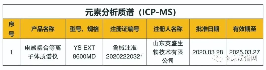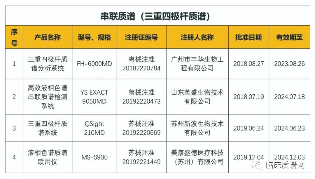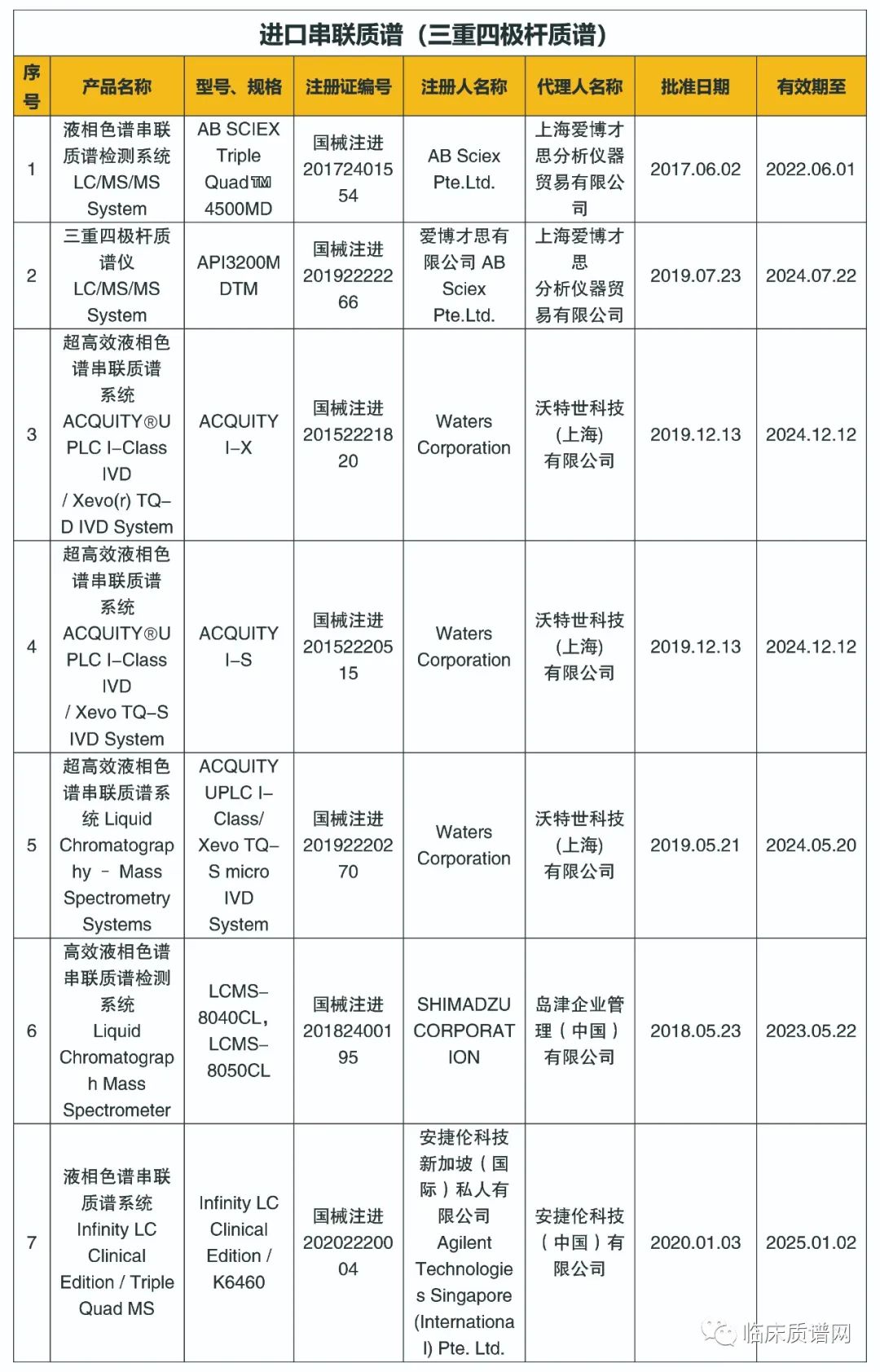 名 称:三重四极杆质谱仪LC/MS/MS System 产品型号:API3200MDTM 注册机构:爱博才思有限公司AB Sciex Pte.Ltd. 代理人 :上海爱博才思分析仪器贸易有限公司 生产地 :新加坡 结构组成:该产品主要由三重四极杆质谱仪和随机软件组成,包括Analyst MD软件(版本号:1.6), Cliquid MD软件(版本号:3.3)和MultiQuant MD软件(版本号:3.0)。 适用范围:该产品基于液相色谱-质谱联用技术以液相色谱作为分离系统,质谱作为检测系统,与配套的检测试剂共同使用,在临床上用于对来源于人体的生物样品,包括但不限于全血,血浆,血清,尿液,脑脊液,唾液、组织匀浆液等样本中的无机或有机化合物(如铅、汞和药物成分等)进行定性或定量检测,包括内源性物质如氨基酸类、肉毒碱和糖类物质,外源性如药物。 有效期 :2019.07.23-2024.07.22 名 称:超高效液相色谱串联质谱系统(ACQUITY UPLC I-Class IVD / Xevo TQ-S IVD System) 产品型号:ACQUITY I-S 注册机构:Waters Corporation 代理人 :沃特世科技(上海)有限公司 生产地 : 结构组成:该产品由超高效液相色谱仪ACQUITY UPLC I-Class、三重四极杆质谱仪Xevo TQ-S、软件(MassLynxTM,版本号:4.1)组成。其中超高效液相色谱仪组成部件包括:二元溶剂管理器、样品管理器、高温色谱柱控温箱、样品组织器(可选)。 适用范围:该产品基于色谱与质谱技术,在临床上用于对来源于人体的生物样品,包括全血,血浆,血清,尿液,唾液等的被分析物进行定性或定量检测,包括诊断指示物和治疗监控化合物。 有效期 :2019.12.13-2024.12.12