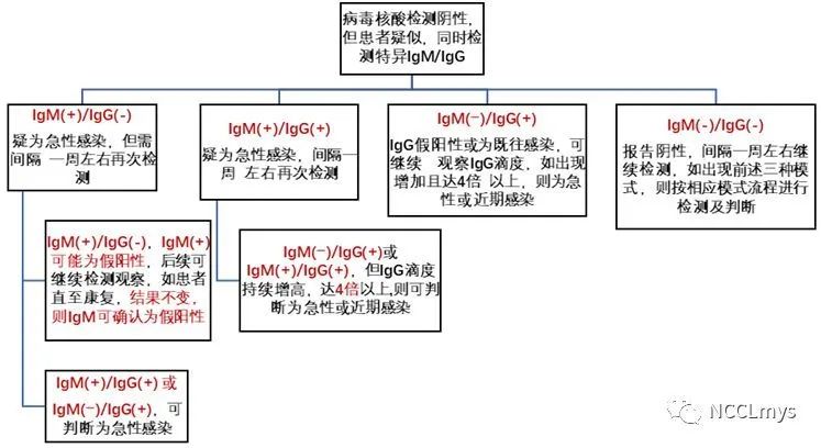当然,对于临床疑似患者,特异IgM和IgG抗体的检测也可与病毒核酸检测同时进行,当核酸检测为阴性时,抗体检测出现图1中的四种模式的任何之一,不管后续的核酸检测是否阳性,只要是真正的病毒感染者,应基本上都可以通过后续的抗体动态检测出现的结果模式明确诊断。