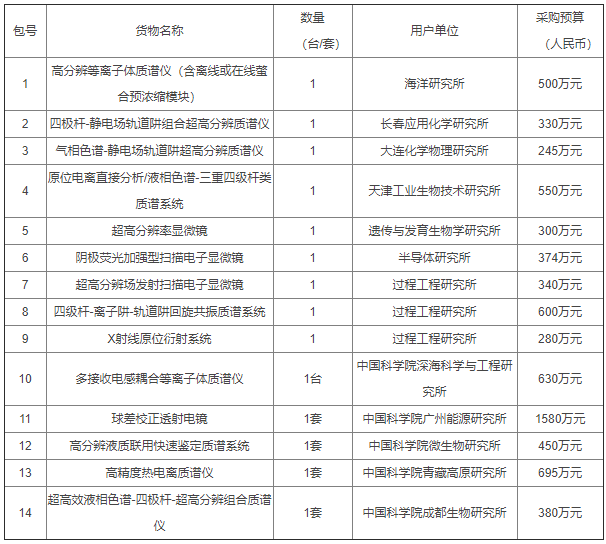 日前,中科院连发两则招标公告,预算22701.9万元采购44台/套仪器设备,包括高分辨等离子体质谱仪、四极杆-静电场轨道阱组合超高分辨质谱仪、原位电离直接分析/液相色谱-三重四级杆类质谱系统、四级杆-离子阱-轨道阱回旋共振质谱系统、球差校正透射电镜、聚焦离子束扫描电子显微镜等。中国科学院2020年仪器设备部门集中采购项目公开招标公告  项目名称:中国科学院2020年仪器设备部门集中采购项目  项目编号:OITC-G200260791-1  开标时间:2020年07月15日 14:00  预算金额:7254.000000万元(人民币)  采购项目的名称、数量、简要规格描述或项目基本概况介绍: