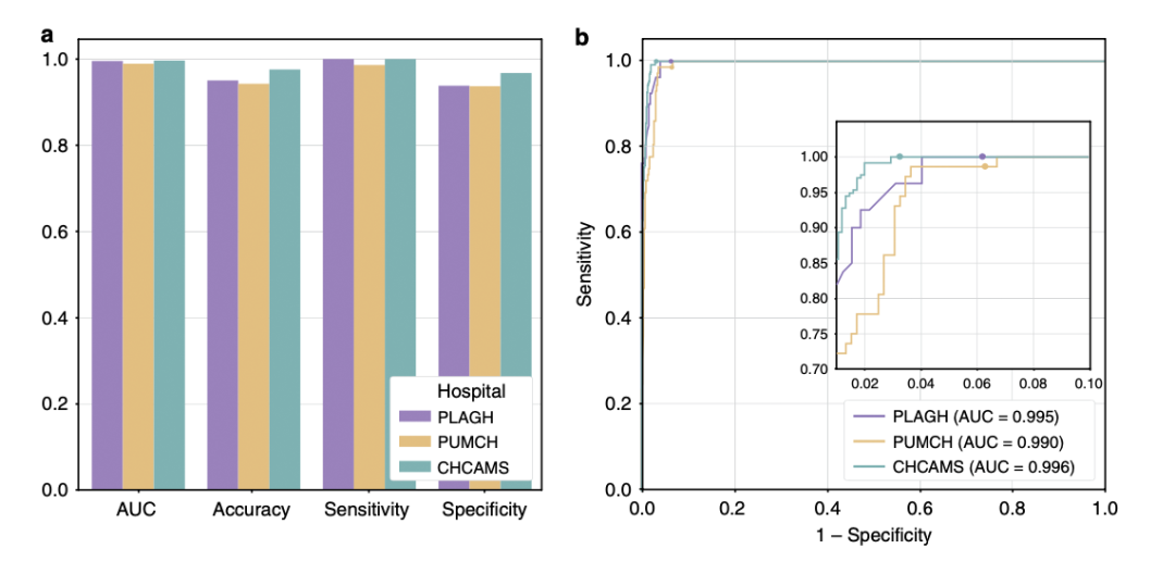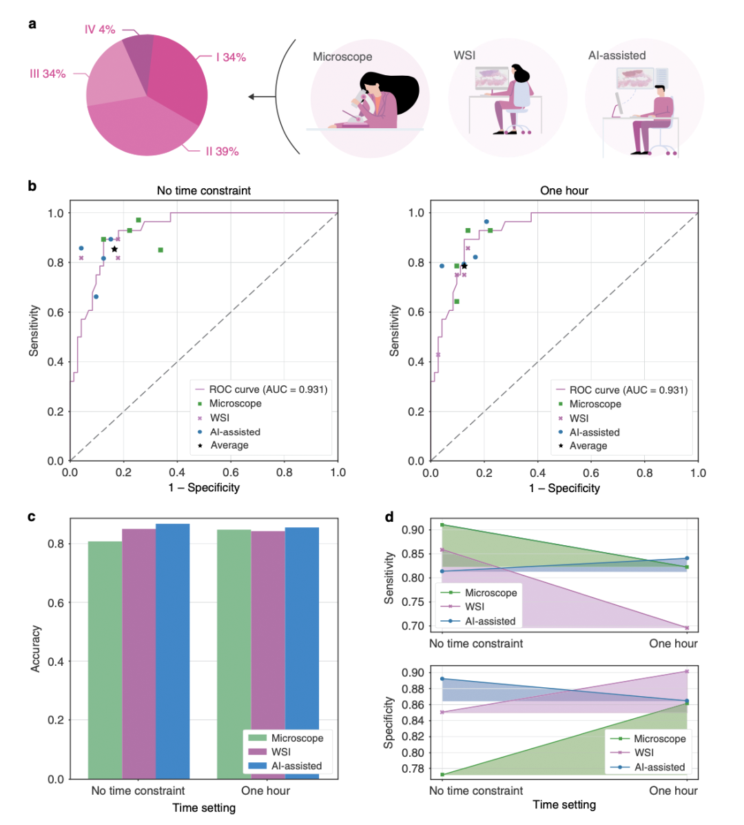 图6. 多中心测试结果,模型在医科院肿瘤医院与北京协和医院的样本上获得了接近100%的敏感度和超过90%的特异性 经过多中心测试,深度学习模型在医科院肿瘤医院与北京协和医院的样本上,能够达到接近100%的敏感度和超过93%的特异性,稳定性卓越。为了验证人工智能系统在临床诊断中的表现,研究团队邀请了12名初级病理医生参与了人机协同测试。12名医生被随机分为显微镜组、数字切片组与人工智能辅助组,并施加了不同强度的压力(不限制诊断时间 vs. 限制一个小时的诊断时间)。研究发现,加入时间约束后,显微镜组与数字切片组的医生均呈现出漏诊率的增加,而人工智能的辅助显著提升了医生诊断的稳定性,诊断敏感度得以保障。 人工智能系统能够在有限的诊断时间内,保障诊断质量,有效防止漏诊的发生。目前,人工智能辅助诊断系统已在数十家大型三甲医院大规模应用,未来将会成为病理诊断常规辅助工具,惠及越来越多的病理医师。本研究所提出的方法论,适用于所有器官病理人工智能系统的建立,能够帮助研究人员加速智慧病理的研发进程,进而造福更多的患者。 展望未来的病理科,数字病理与人工智能将推动传统病理走向智慧病理时代。病理医师可以将一些重复、繁锁的病理诊断工作交由人工智能辅助诊断系统完成。从而让病理医师有更多的时间进行复杂疾病的诊治和前沿领域的研究,推动医疗技术的发展。