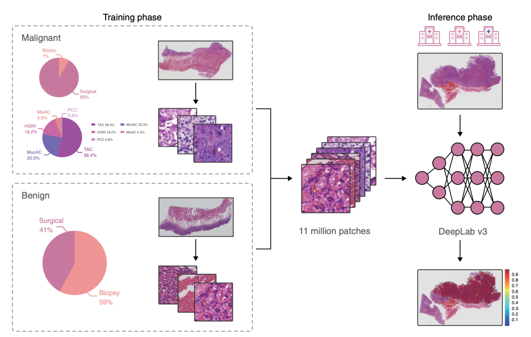 伴随着病理人工智能的不断发展,数字病理的价值被最大化发挥,医师通过全数字切片能够获得机器的辅助诊断结果,在提高诊断效率的同时有效降低漏诊。病理影像具有文件体积大、信息量丰富、噪声种类多等特点,需要设计强大的人工智能模型对其进行建模,同时需要构建高效可扩展的存储和运算系统,对影像进行快速分析。 可用于临床诊断的病理辅助诊断系统,需要满足以下几个条件:(1)深度学习模型需要通过多款病理切片扫描仪所获得数千张连续样本的测试,敏感度应当接近100%,特异性超过80%。(2)通过人工智能系统的辅助,病理医师在不延长诊断时效的基础上,能够提高诊断的准确率。通过对模型的深入分析,我们可以知晓人工智能的优势与劣势,从而让病理医师建立与人工智能的基础信任。(3)人工智能辅助诊断系统需要经过来自多家医院病理切片的多中心验证,以确保系统在不同医院运行时的稳定性。虽然近些年来病理人工智能领域取得了一定的研究进展,但是均无法达到临床应用的标准。在这个工作中,研究人员报道了已在解放军总医院临床应用的胃癌病理辅助诊断系统。该系统在解放军总医院超过3000张真实世界测试切片上达到了接近100%的灵敏度和80.6%的特异性,这些切片使用了三款不同品牌的切片扫描仪进行了数字化。通过人机协同实验与预测结果的细致分析,研究人员证实该系统能够帮助病理学家提高诊断准确率、防止误诊。与此同时,通过医科院肿瘤医院与北京协和医院样本的多中心测试,研究人员证明了该系统的稳定性。 图1. 深度学习模型训练与测试框架,本研究采用深度图像分割模型,并证明分割相比分类模型,具有更好的准确率、可解释性及运算效率