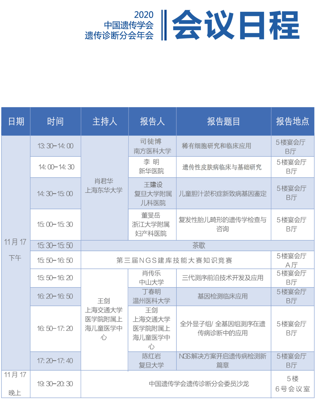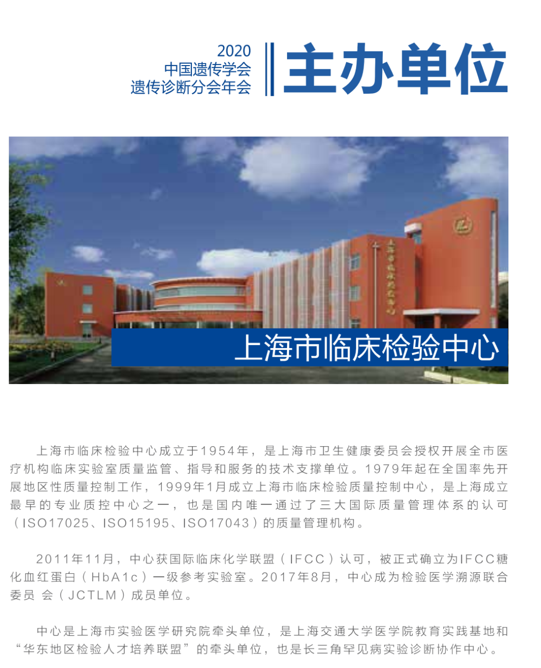 由中国遗传学会遗传诊断分会、 上海市实验医学研究院 上海市遗传学会主办 2020年中国遗传学会遗传诊断分会年会 将于2020年11月17-18日在上海明天广场召开 (上海市南京西路399号) 本次大会凝聚来自全国的遗传诊断和实验医学相关领域专家学者,就基因诊断技术在肿瘤、遗传病、多基因疾病、感染性疾病、产前诊断和辅助生殖等方面的应用进展作专题报告,为领域的热点、难点和新成果、新进展而交流思想,畅抒己见。会上我们将见证上海实验医学研究院的成立揭牌仪式,并举行第三届NGS建库技能大赛优秀选手、上海市遗传学会青年遗传学论坛获奖选手颁奖仪式。 完整本通知请查看:2020中国遗传协会遗传诊断分会年会 2020年11月17-18日 上海明天广场(上海市南京西路399号)JW万豪酒店 |