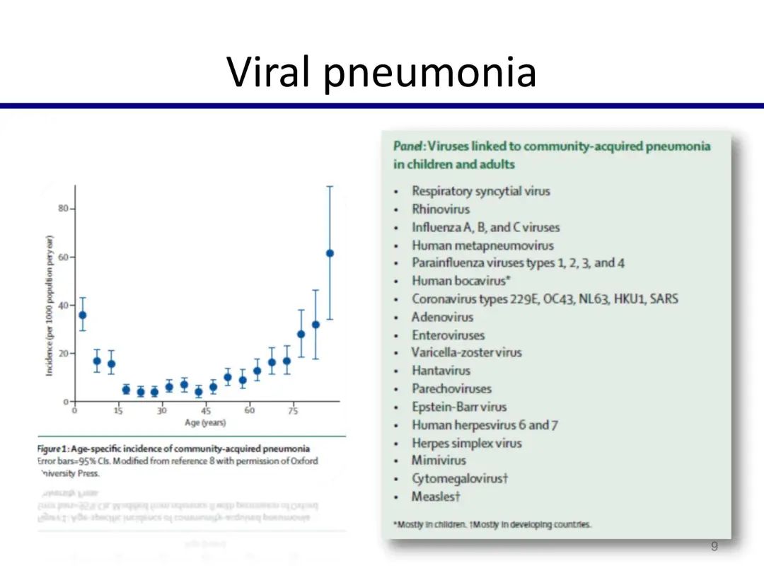 上图是梅立埃的Filmarray多重PCR的检测平台,在国内目前还没有应用。其呼吸道试剂盒可以检测大多数呼吸道病毒,同时包括常见的细菌感染,甚至包括一些重要耐药基因,如:金黄色葡萄球菌的mecA基因,碳青霉烯耐药(KPC、NDM、OXA-48等)等。所以,对于重症患者而言,可能更需要在一两个小时内拿到检测结果,及时指导临床用药,类似的POCT快速多重PCR检测平台具有重要价值。患者是病毒感染还是细菌感染,或者可排除此类感染?这样的检测设备或检测理念非常重要。 这是病毒性肺炎主要的病原谱,可以看到,这些病原谱实际上非常适合多重PCR的靶点设计。