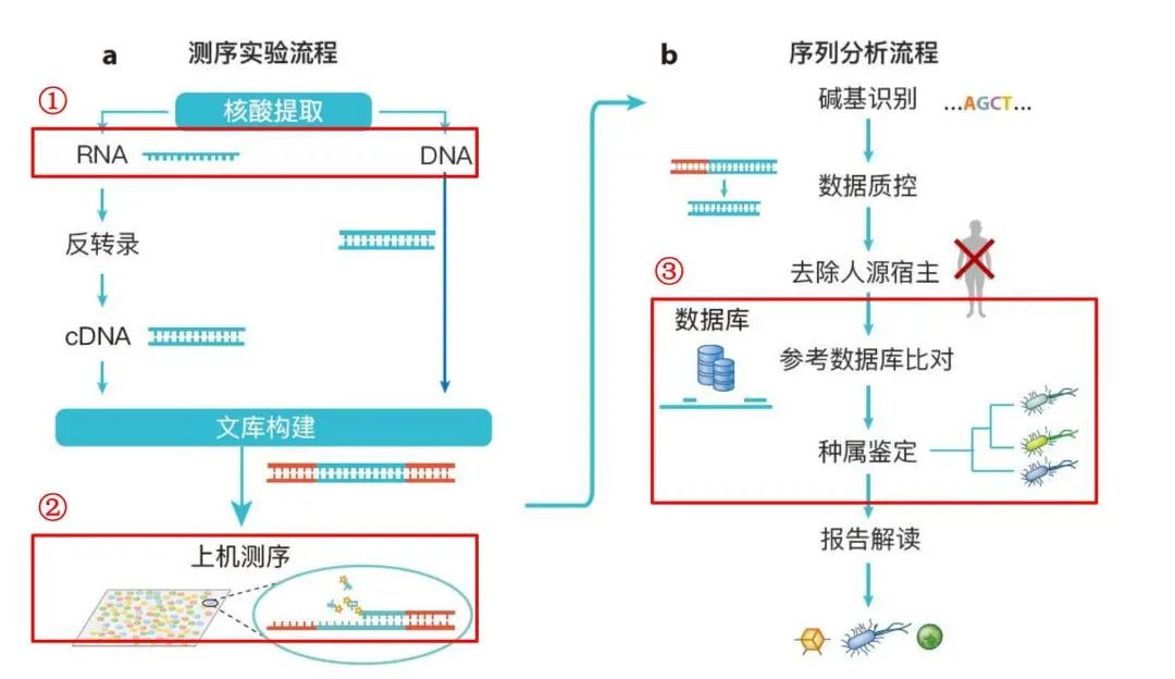 mNGS、WGS和TNGS的概念较易混淆,但掌握几点核心就可分清……质谱的弱点是不能对样本进行检测 mNGS检测,首先mNGS、WGS和TNGS这几个概念比较容易混淆,但我们只要知道,mNGS主要针对样本,样本送检后直接进行mNGS检测,而且这种检测无偏移(unbias),不预设目标,可检测到样本中所有病原微生物;而TNGS即有靶向的测序,可以检测其中的细菌,或者看它分布的情况,可以用16S rRNA对细菌进行扩增,再进行相关测序,与mNGS成本较低,其灵敏度较高,缺点是会遗漏真菌、寄生虫、病毒等微生物;WGS主要应用于已分离出来的纯菌落的基因组检测。