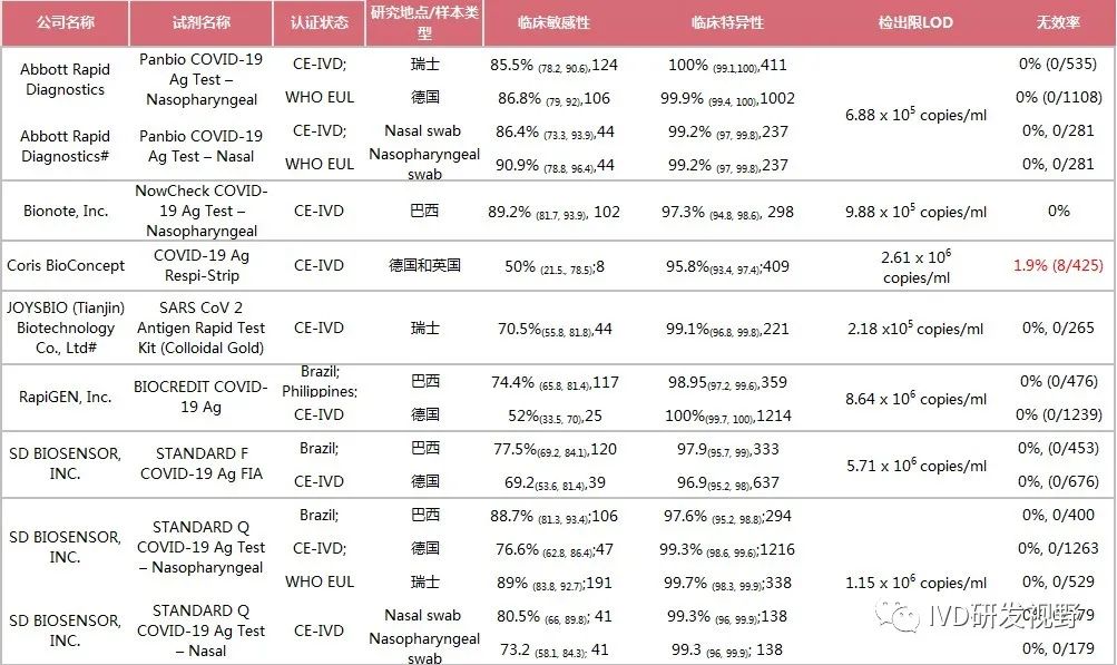 1.前言FIND是一家全球性非营利性组织,致力于推动诊断技术开发和产品应用方面的创新,以抗击影响世界最贫困人口的主要疾病。 FIND正在与WHO、HUG等合作对新冠病毒核酸检测试剂、抗体检测试剂、抗原检测试剂进行独立测试评估以协助决策。 下文为FIND评估POCT类新冠抗原检测试剂盒的性能数据。新冠抗原检测试剂盒的临床敏感性和特异性整体优于新冠抗体检测试剂盒,特别是对于发病早期的准确性从理论和数据上优于新冠抗体检测试剂盒,临床特异性好于新冠抗体检测试剂盒。 2.新冠抗原快速检测试剂盒评估方案2.1入选样本前瞻性样本:疑似COVID-19的患者被邀请参与研究,每位参与者分别使用2个试子采集样本,1个试子样本用于RT-PCR核酸检测,另1个试子样本用于新冠抗原检测。回归性样本:采用临床剩余样本进行研究,所有样本均有完整的RT-PCR结果,包含发病时间及临床症状等信息。阳性和阴性样本例数均不少于100例,阴性样本最好能大于300例。2.2比对系统合格RT-PCR新冠核酸试剂的测试结果作为患者阴阳性判定的金标准。2.3试验方案实验室评估:评估新冠抗原检测试剂的检出能力,试验方法为使用梯度稀释的病毒培养物投料至试子,并且溶解于制造商指定的保存液中,加入规定体积样品至检测试剂卡中,所有判定结果均为阳性时的最低病毒培养物浓度为检出限。临床评估:评估新冠抗原检测试剂的临床敏感性和特异性。临床敏感性为真阳性率即RT-PCR确诊的阳性样本中被抗原检测试剂判定为阳性的比例;临床特异性为真阴性率即在RT-PCR确诊的阴性样本中被抗原检测试剂判定为阴性的比例。当样本数量达到25%或是50%时进行初步评估,如果特异性小于97%则停止后续评估。WHO要求新冠抗原检测试剂盒的临床敏感性≥ 80% ,临床特异性 ≥ 97%。图1 获得CE认证及其它国家认证的7个新冠抗原试剂的临床性能备注:%值为敏感性或特异性值,()中数据为95%置信区间,置信区间后数据为阳性或阴性样本数量。 多数厂家检测试剂卡没有出现无效情况,仅一家公司产品存在1.9%的无效率,无效率是客户对产品的第一印象,虽然不影响实际的临床结果判断,但会降低客户对产品质量的信任。使用病毒培养物评估试剂的检出限LOD,该LOD性能指标与临床敏感性相关,可以推测临床敏感性。如研发者无资源和条件直接评估临床敏感性,可使用病毒培养物评估检出限,从而推测临床敏感性。同一厂家产品在不同研究地点、不同的样本数量下的临床性能有显著差异,但能否应用于临床的结论是一致的。
