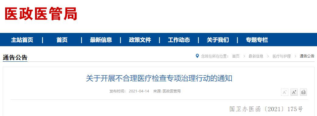摘要: NEWS4月14日,国家卫健委等六部门联合印发《不合理医疗检查专项治理行动工作方案》,将通过开展为期一年的专项治理行动,严查损害人民群众利益的不合理医疗检查,包括实验室检查、病理学检查、各类影像学检查等。文 ...