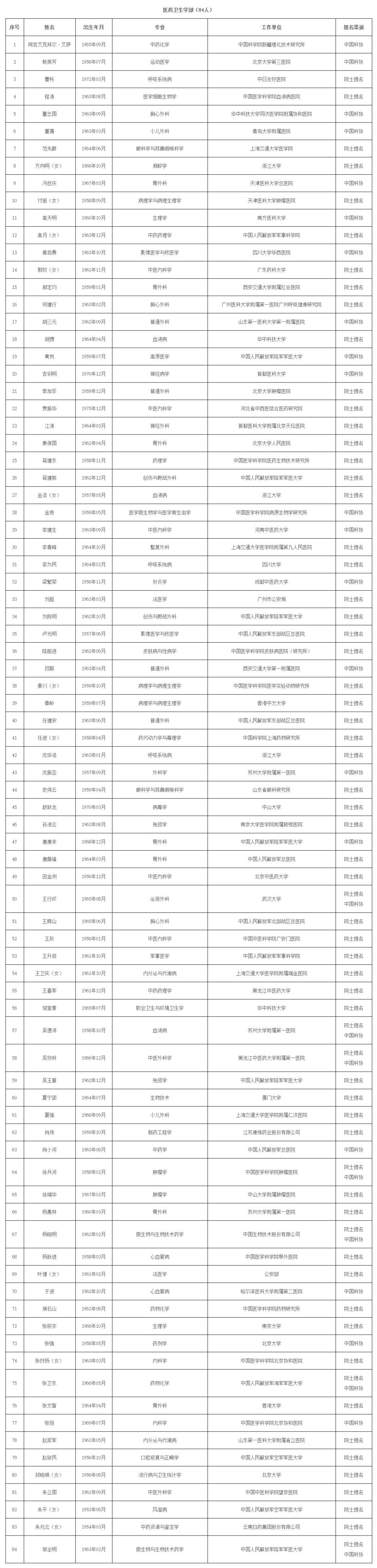日前,中国工程院公布了2021年院士增选有效候选人名单,经中国工程院主席团审议,确定2021年院士增选有效候选人577位。其中,医药卫生学部84人。名单如下: