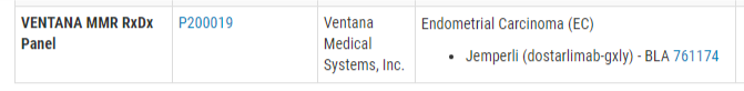 2021年4月22日,美国FDA加速批准了葛兰素史克的dostarlimab-gxly(Jemperli)用于治疗复发或晚期错配修复缺陷(dMMR)子宫内膜癌成人患者,JEMPERLI成为了第一款用于子宫内膜癌的PD-1疗法;而值得关注的是,此次罗氏Ventana MMR RxDx Panel作为伴随诊断试剂同时获批,用于筛选最适合用药的患者,这是FDA批准的首个基于MMR生物标记物的伴随诊断试剂。 上个月刚进行的 盘点 | 截止2021年3月,FDA获批伴随诊断产品 中,免疫治疗相关生物标记物再添一员。同时,和MMR密切相关的MSI,其近期在伴随诊断领域的进展也佐证了免疫治疗正步入更加精准的时代,详见 伴随诊断 | Biocartis提交FDA,首个MSI伴随试剂值得期待 。 FDA官网的伴随诊断试剂列表已作如下更新: 从临床适应症角度看,Ventana MMR RxDx Panel也是首个在子宫内膜癌患者中,评估PD1免疫治疗资格的伴随诊断试剂。子宫内膜癌是美国最常见的妇科癌症,在北美女性中是第四常见的癌症。在我国,子宫内膜癌发病率也呈逐年上升趋势,在北上广甚至已超过子宫颈癌,成为女性生殖系统恶性肿瘤的首位。全球范围内,每年约有90,000女性死于子宫内膜癌或一线治疗后。 罗氏诊断首席执行官Thomas Schinecker表示:“我们很高兴与GSK一起开展这项伴随诊断测试,以帮助复发或晚期子宫内膜癌患者进行有限的治疗选择。” “这项测试为临床医生提供了一种有效的工具,可以确定最适合使用GSK JEMPERLI免疫治疗的患者,为患有MMR缺陷型子宫内膜癌的女性患者提供新的治疗选择。” Ventana MMR RxDx Panel为临床医生提供了标准化、全自动的MMR检测,利用免疫组化(IHC)方法对四种MMR标志蛋白:MLH1, PMS2, MSH2, and MSH6,进行全面检测。 关于MMR MMR是一种分子机制,如果任一MMR蛋白表达缺失(dMMR),可造成细胞的错配修复功能缺陷,则对DNA复制过程中的碱基错配丧失修复功能。四个MMR蛋白里任何一个蛋白的表达是缺失的(阴性),肿瘤就属于dMMR;如果四个蛋白全部表达阳性,肿瘤是pMMR。