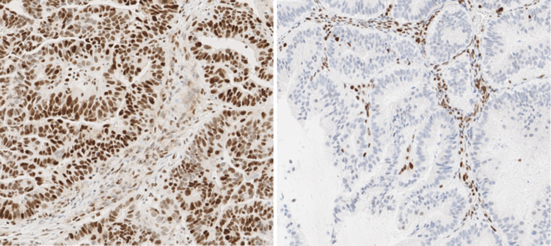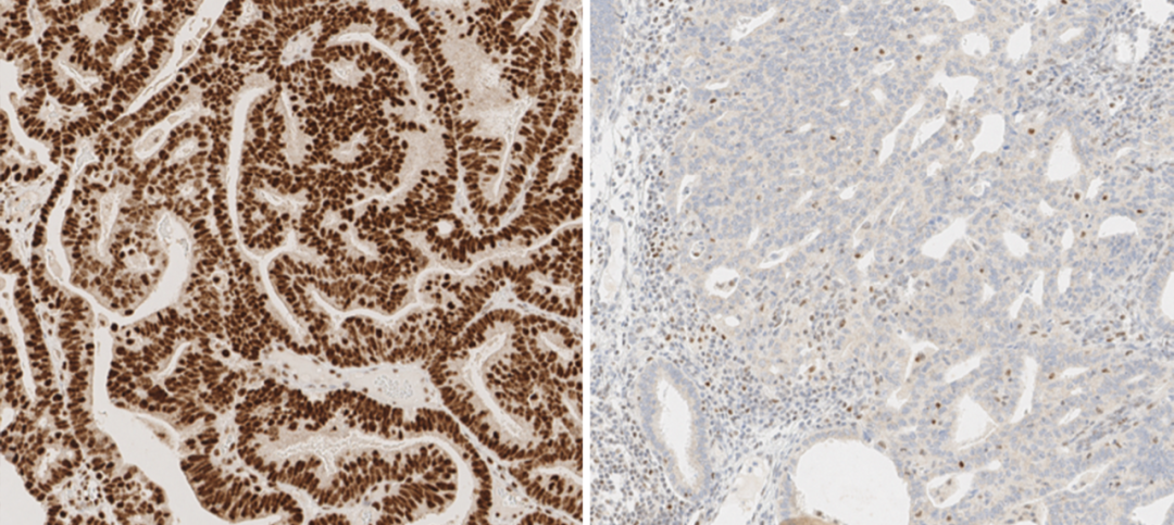 Figure 1: VENTANA anti-MLH1 (M1) Mouse Monoclonal Primary Antibody staining with Intact (left) or Loss (right) of expression in the presence of evaluable internal controls in endometrial carcinoma tissue. Figure 2: VENTANA anti-MSH6 (SP93) Rabbit Monoclonal Primary Antibody staining with Intact (left) or Loss (right) of expression in the presence of evaluable internal controls in endometrial carcinoma tissue. Figure 3: VENTANA anti-MSH2 (G219-1129) Mouse Monoclonal Primary Antibody staining with Intact (left) or Loss (right) of expression in the presence of evaluable internal controls in endometrial carcinoma tissue. Figure 4: VENTANA anti-PMS2 (A16-4) Rabbit Monoclonal Primary Antibody staining with Intact (left) or Loss (right) of expression in the presence of evaluable internal controls in endometrial carcinoma tissue. References:FDA官网,Roche官网 -END- |