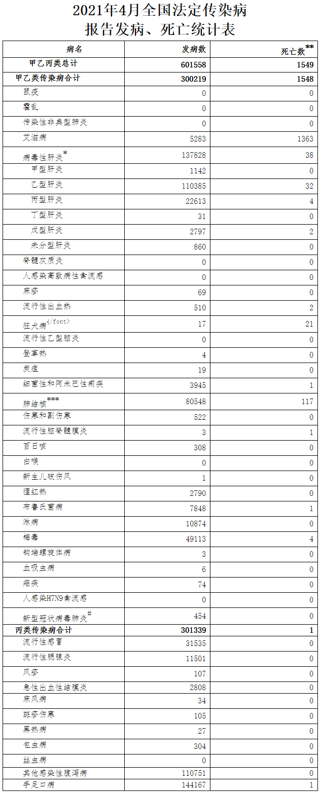 2021年4月(2021年4月1日0时至4月30日24时),全国(不含香港、澳门特别行政区和台湾地区,下同)共报告法定传染病601558例,死亡1549人。