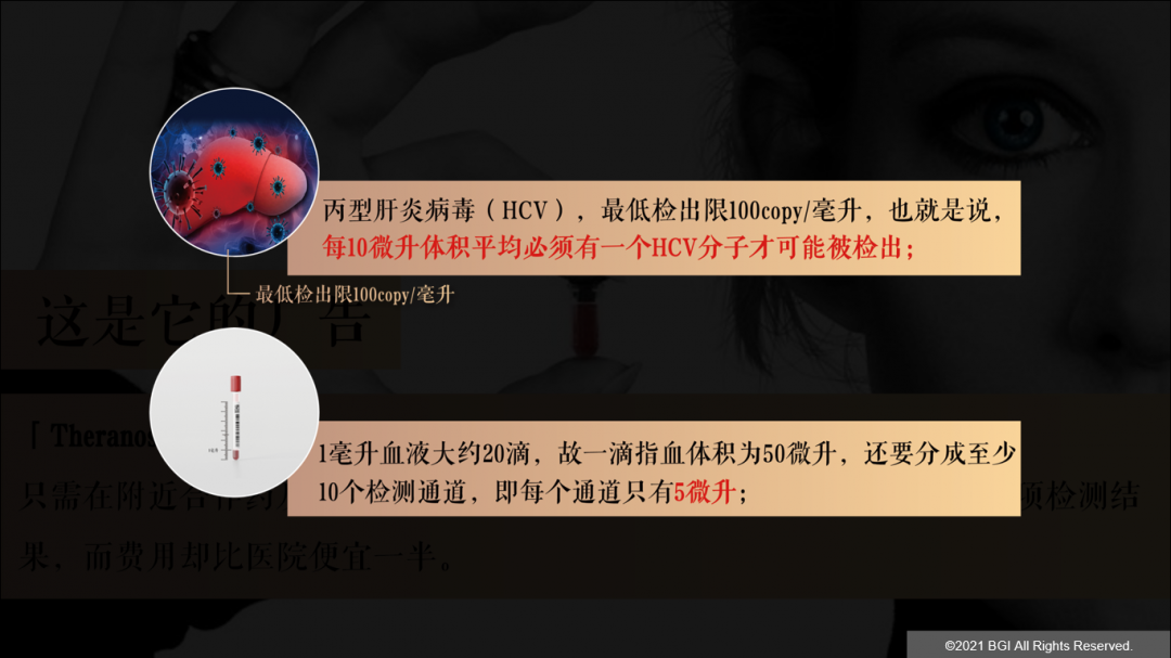 我们再来看看Theranos的血检法。就拿丙肝病毒(HCV)来说,它的最低检出限是100copies/mL,也就是说每10μL的血必须要有1个HCV分子才可能被检出。而1滴血是50μL,要分成至少10个检测通道,每个通道只有5μL的血,从概率来说能检出HCV的可能性更是微乎其微。