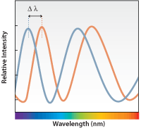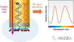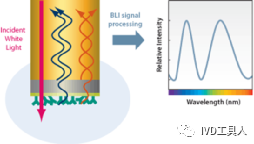 当待检测分子被生物膜上的生物分子捕获后,这层生物膜厚度增加,导至干涉光波发生相对位移,通过检测光谱位移的大小Δλ就可以得知结合的分子多少。