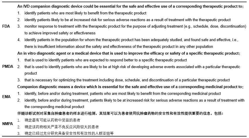 表1. FDA、PMDA、EMA有关伴随诊断定义的比较[1,2,3,10]