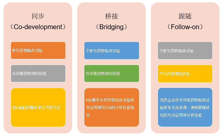 图2. 同步、桥接、跟随三种伴随诊断开发方法的特点