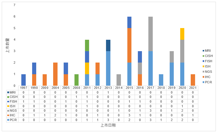 图1. FDA历年批准的伴随诊断数量(按方法学分类统计)【5】