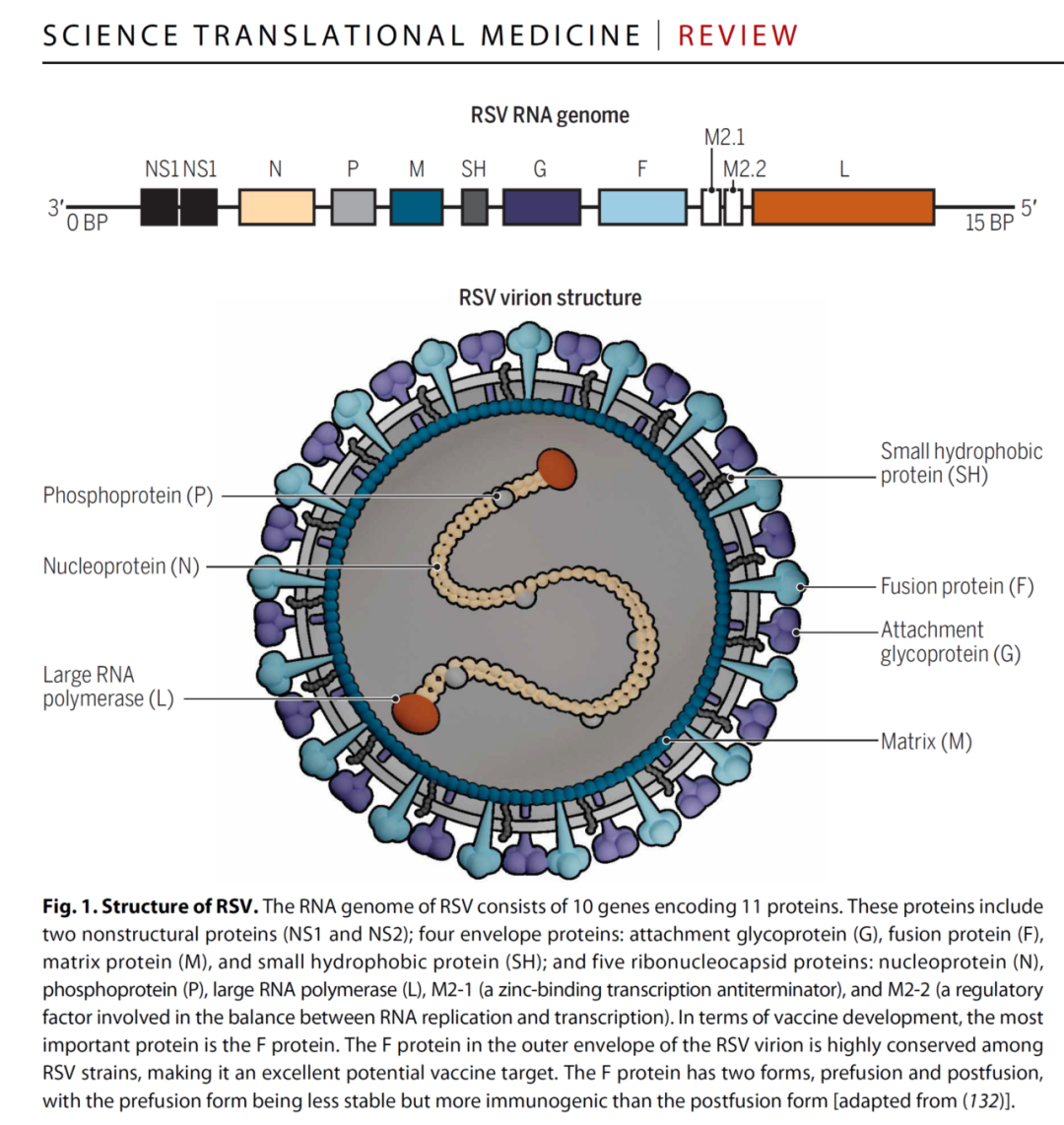 RSV是1956年从黑猩猩呼吸道标本分离出来的,因其在细胞培养过程中导至相邻细胞融合,细胞病变形成类似合胞体的结构而被称为呼吸道合胞病毒。RVS的基因组结构为非节段性单股负链RNA,基因组全长约为15.2kb,编码11个蛋白质; 非结构蛋白:NS1、NS2; 包膜蛋白:黏附蛋白G、融合蛋白F、基质蛋白M、小疏水蛋白SH; 核糖体蛋白:核蛋白N、磷蛋白P、多聚酶亚单位蛋白L、M2-1、M2-2; 其中,G和F蛋白是RSV膜表面2个重要的糖蛋白,为病毒重要的抗原蛋白,是刺激机体产生中和抗体的主要病毒抗原。 图1:RSV的基因组及蛋白结构功能示意图