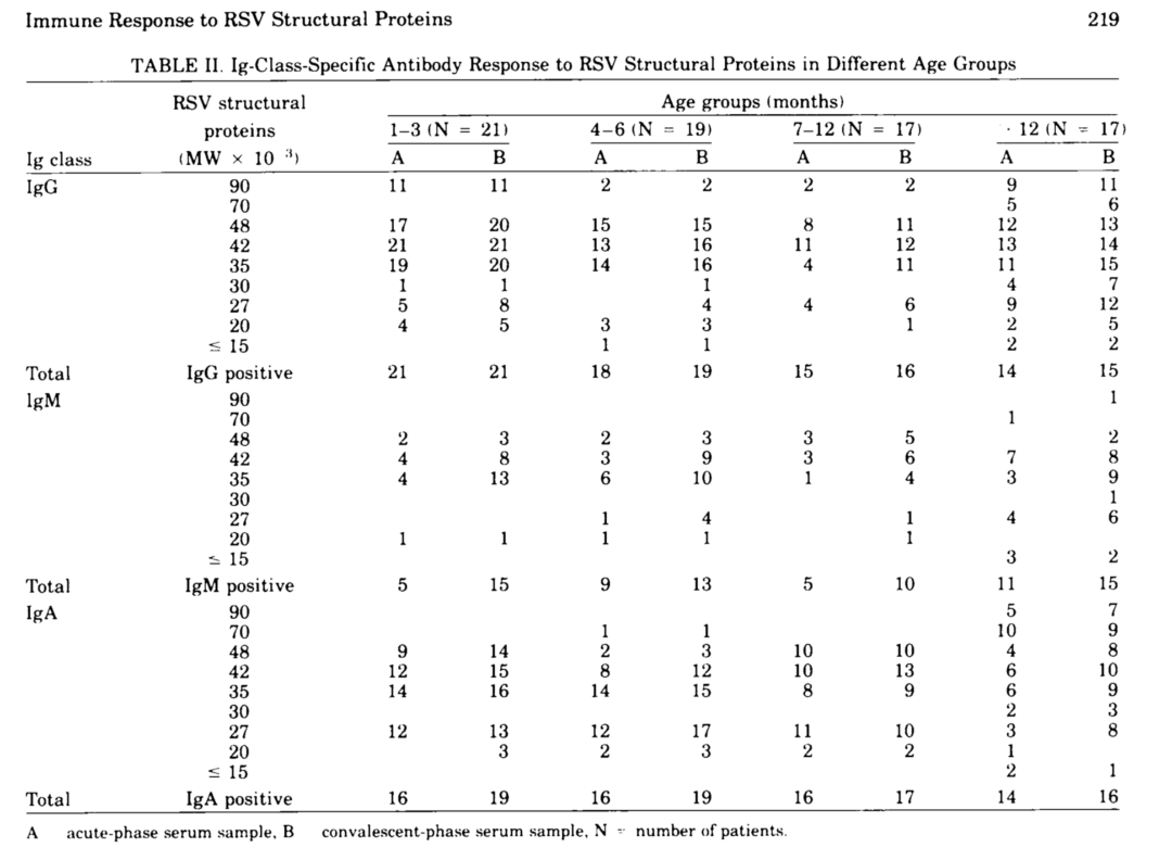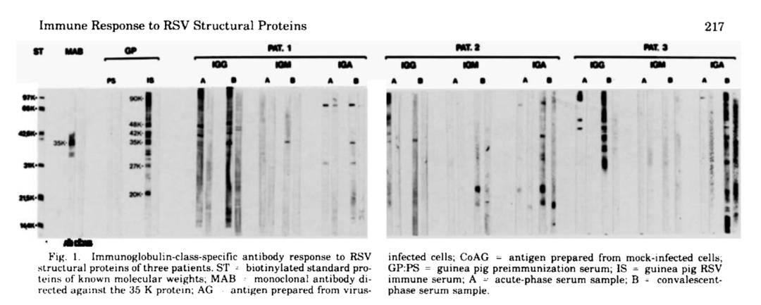 在佐治亚州亚特兰大的疾病控制中心的研究发现,在近期感染RSV患者的急性期和恢复期的配对血清中,参与集体中免疫应答过程中的抗原位点包括黏附蛋白G、融合蛋白F、核蛋白N、磷蛋白P。
