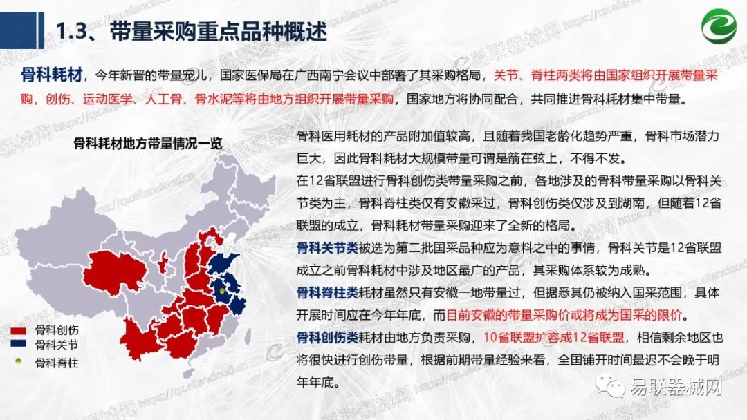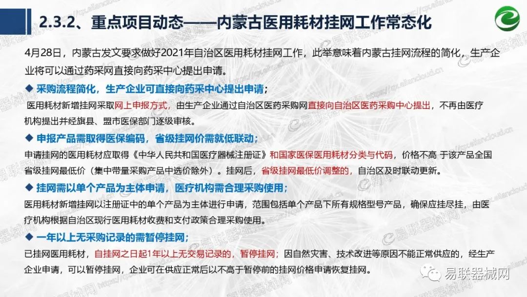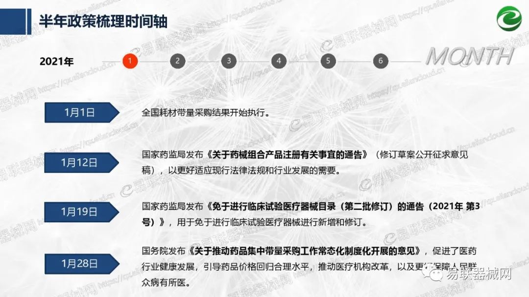 带量采购方面:2021年上半年,带量采购持续发力,仍是行业内的焦点所在。首批带量采购项目即将届满,相应续标工作有序展开;带量采购常态化、规范化文件相继出台,引领耗材带量采购走向新的篇章…… 常规项目方面:各地挂网工作有序开展,新老平台切换稳步推进;地方工作上:北京耗材限价挂网、内蒙古简化挂网流程、四川与江西规范并完善药耗集采工作、河南持续推进阳光挂网、海南实行“红黄绿”价格预警…… 政策方面:八部委联合印发带量采购规范文件,指导高值医用耗材集中带量采购;信用评价制度建立,严厉打击医疗行业不正当利益关系;医疗服务价格改革试点方案发布,建立合理补偿机制,稳定调价预期;医疗器械唯一标识第二批实施工作即将开展;《医疗器械监督管理条例》修订发布,旨在保障医疗器械安全、推动行业健康发展…… |
