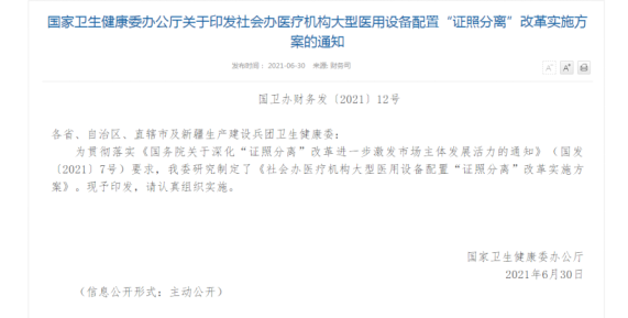 《通知》中提出:在全国范围内,社会办医疗机构乙类大型医用设备配置许可开始实行告知承诺制;在自由贸易试验区内,社会办医疗机构乙类大型医用设备配置将由审批改为备案管;在全国范围内,进一步优化社会办医疗机构甲类大型医用设备配置许可审批服务。 众所周知,在我国大型医疗设备一直有严格的审批管理制度,医疗机构需获得配置许可证后,才可购置大型医用设备。其中甲类有国家卫健委审批,乙类有省级卫健委审批。
