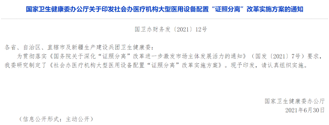 昨天(6月30日),国家卫健委发布了《社会办医疗机构大型医用设备配置“证照分离”改革实施方案》(以下简称“方案”),全国社会办医疗机构大型设备配置全面放开!