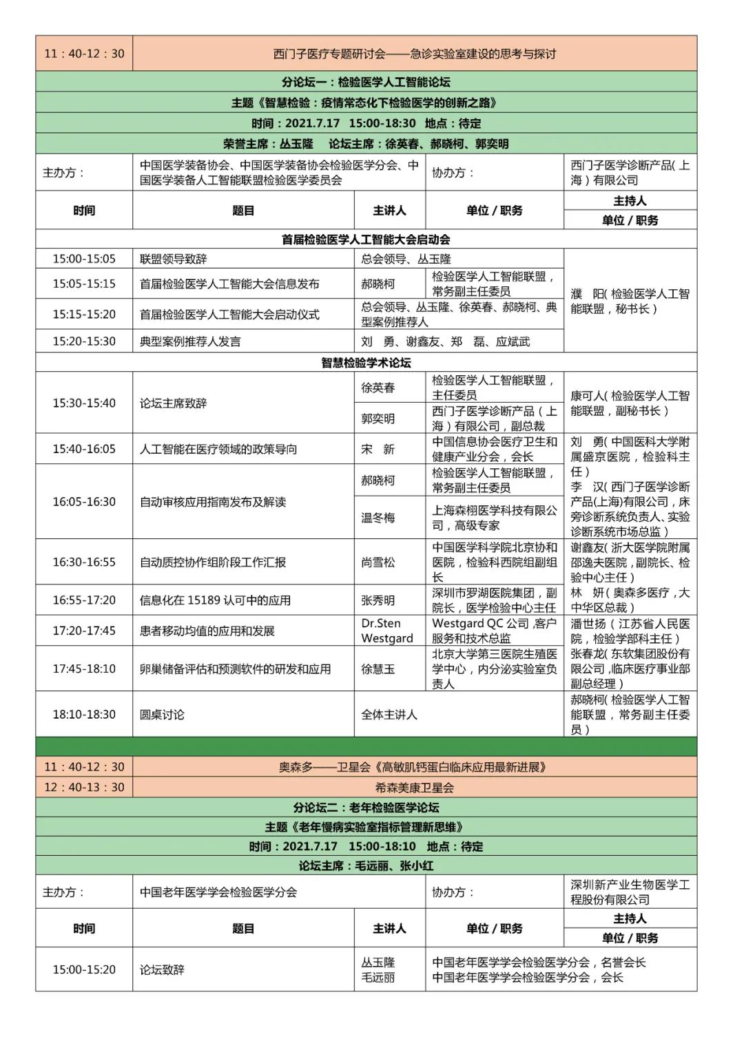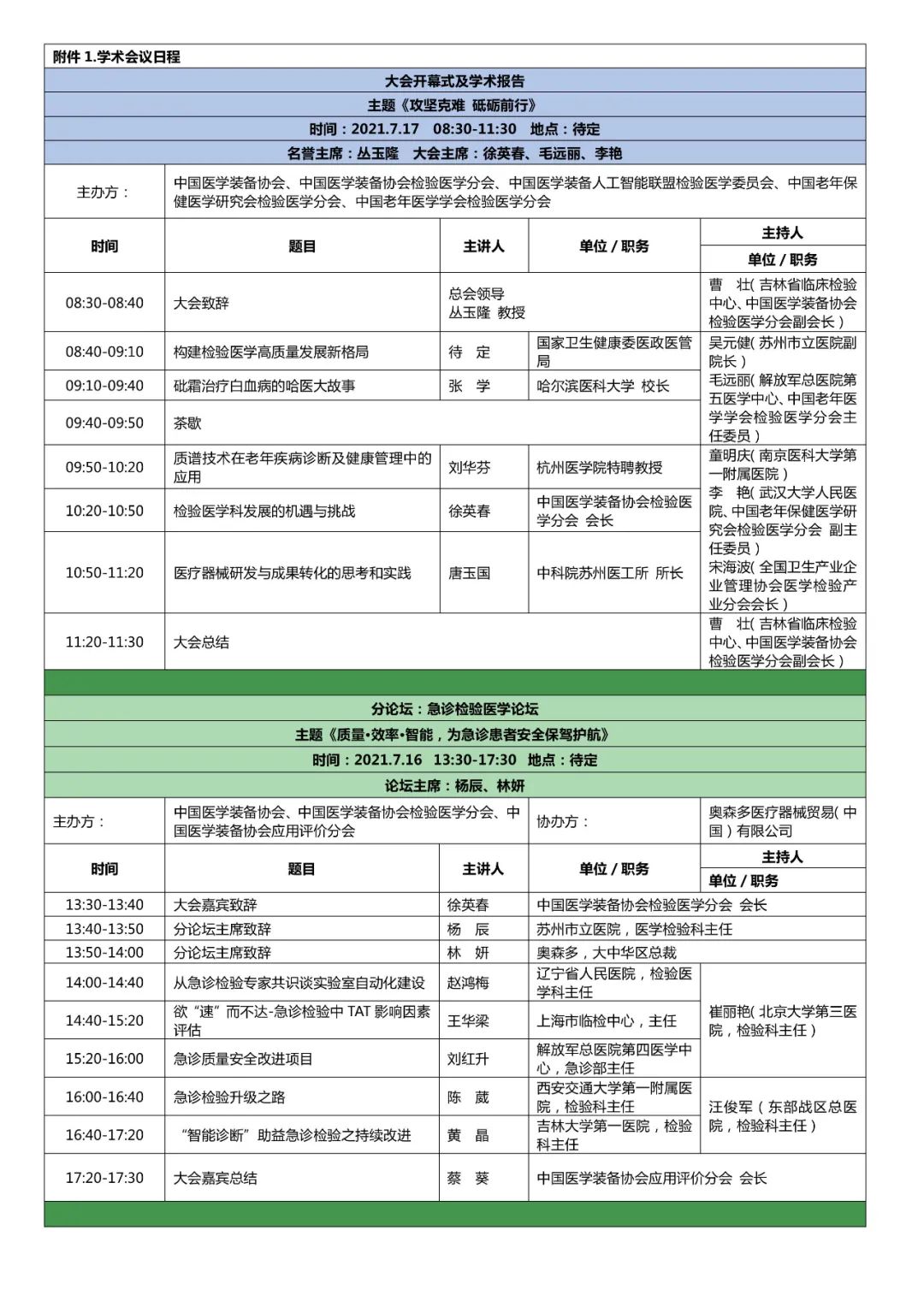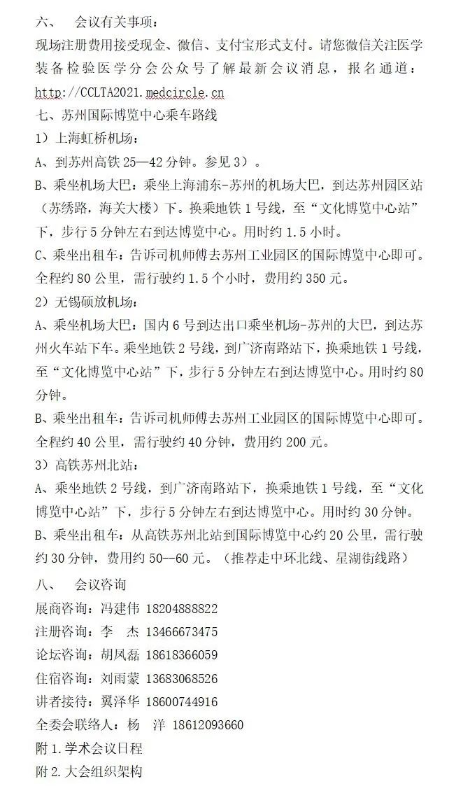 第七届全国检验医学技术与应用学术会议(CCLTA 2021) 暨第四届“一带一路”高峰论坛 第七届全国临床检验装备展览会第三轮会议通知 由中国医学装备协会、中国医学装备协会检验医学分会、中国医学装备人工智能联盟检验医学委员会、中国老年保健医学研究会检验医学分会、中国老年医学学会检验医学分会共同主办,北京生命绿洲公益服务中心承办的“第七届全国检验医学技术与应用学术会议暨第四届‘一带一路’高峰论坛第七届全国临床检验装备展览会”定于2021年7月16日至18日在江苏省苏州国际博览中心召开。大会以“攻坚克难、砥砺前行”为主题,围绕患者安全、国家生物安全、抗击疫情平战结合、AI智慧医疗、DRG医改、体外诊断路径、技术攻关、老年检验与健康等话题进行探讨。国内及国际从事检验医学的管理人员、技术应用人员、IVD企业研发生产人员、医学工程院校科研教学人员、IVD检测和监管人员及相关学科人员将莅临会议现场,并有国内多家大型医院管理者、设备管理者现场参会。这是全国检验界与来自世界的学术大亨集深度学术交流和新技术与新产品展示的盛会,无疑将给大家带来丰硕的学术成果、最新创新知识和开拓未来的启迪,给IVD企业从研发到市场提供多方位、多视角、多线路、多学科的发展空间。 会议内容暂定如下: 一、会议时间:2021年7月16日-18日 二、会议地点:江苏省苏州市苏州国际博览中心 三、学分证书:授于国家继续教育I类学分 四、大会主题:攻坚克难 砥砺前行 五、会议安排 供稿:ELVA |