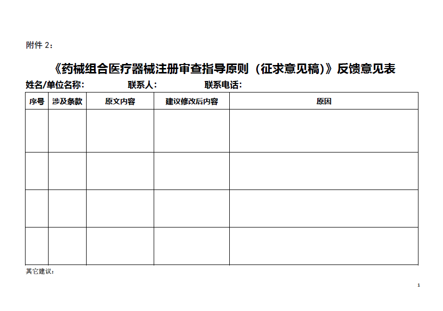 如有任何意见或建议,请下载并填写附件中的《药械组合医疗器械注册审查指导原则(征求意见稿)》反馈意见表,并于2021年8月20日前将反馈意见以电子邮件形式反馈我中心。