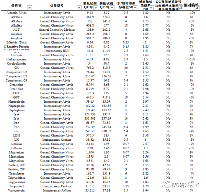 方法:获得试剂批更换验证时检测质控物和临床样本的结果,这些结果来自18种质控物、661个不同试剂批,1483个次质控物检测,82种分析物,7种仪器。通过双样本异方差t检验分析更换试剂批检测质控物的批间差异和更换试剂批检测临床样本的批间差异是否具有显著性。 结果:总体上,40.9%的质控物批间差异与临床样本批间差异具有显著性。当质控物批间差异小于1SD(83.1%)时,37.7%的质控物批间差异与临床样本批间差异具有显著性。当质控物批间差异大于1SD(16.9)时,57.0%的质控物批间差异与临床样本批间差异具有显著性。 结论:不同批试剂检测质控物结果显示不具有互通性的比例较高40.9%,质控物不应该用于评价试剂批更换前后检测临床样本的一致性。 文章的内容主要是对上述方法和结果的详细分析,立场类似临床检验中心监管机构,旨在强调和要求使用质控物的客户和能力验证组织者要对该差异引起重视。否则会对新批次试剂是否可应用造成错误判断,或是对能力验证结果未进行试剂批次分组统计而对验证结果做出错误判断。 3.统计分析案例 以LDL胆固醇测试结果分析为例。数据包括旧批次试剂测试质控品的10个结果、新批次试剂测试质控品的10个结果以及新旧批次测试7个临床样本的结果。通过分析这些数据,确定质控结果的批间差异是否和临床样本批间差异具有统计学意义。计算以标准差(SDI)为单位时质控结果的批间差异大小。 4.新旧试剂批检测质控物的差异 通过质控数据,了解不同方法学原理、项目、厂家的试剂产品批间差异。 ③质控批间差异在±10%以内,但是不代表临床样本批间差异在±10%以内。 ④质控批间差异在±10%以内,同时代表临床样本批间差异在±10%以内。 |